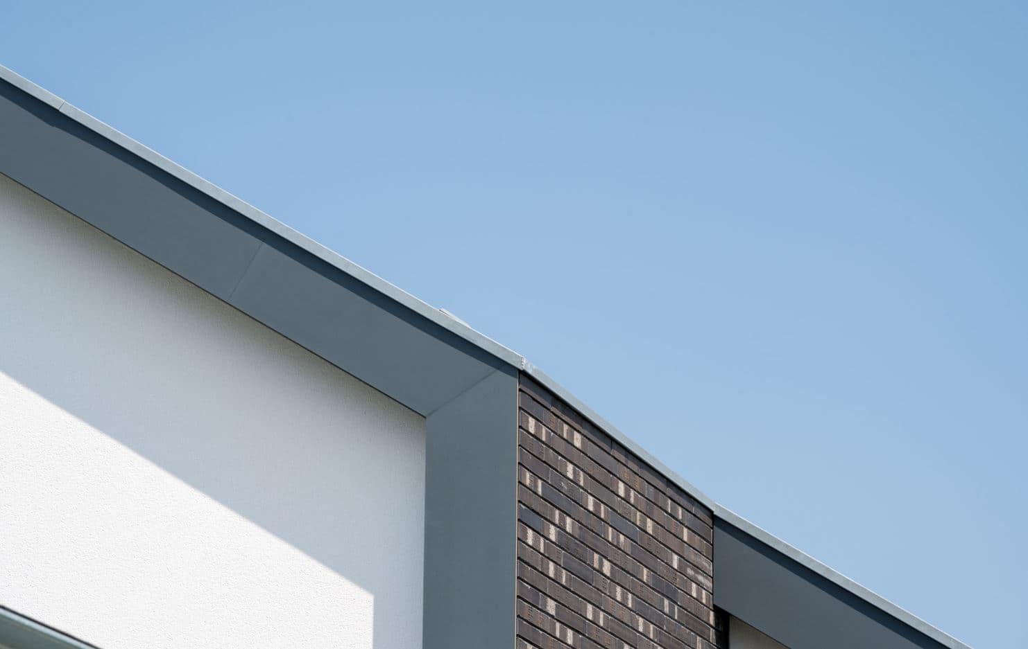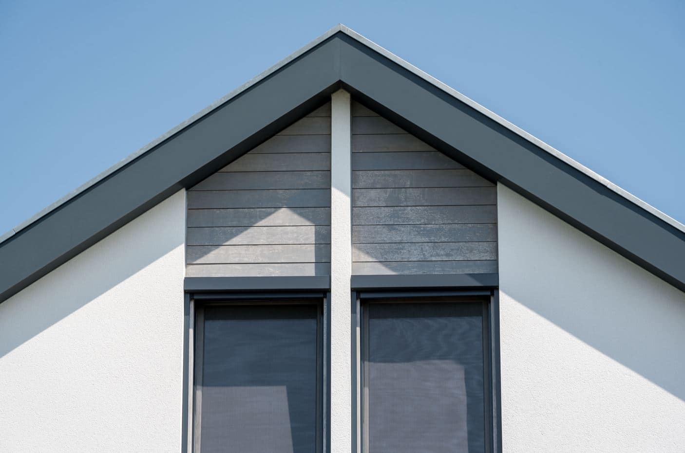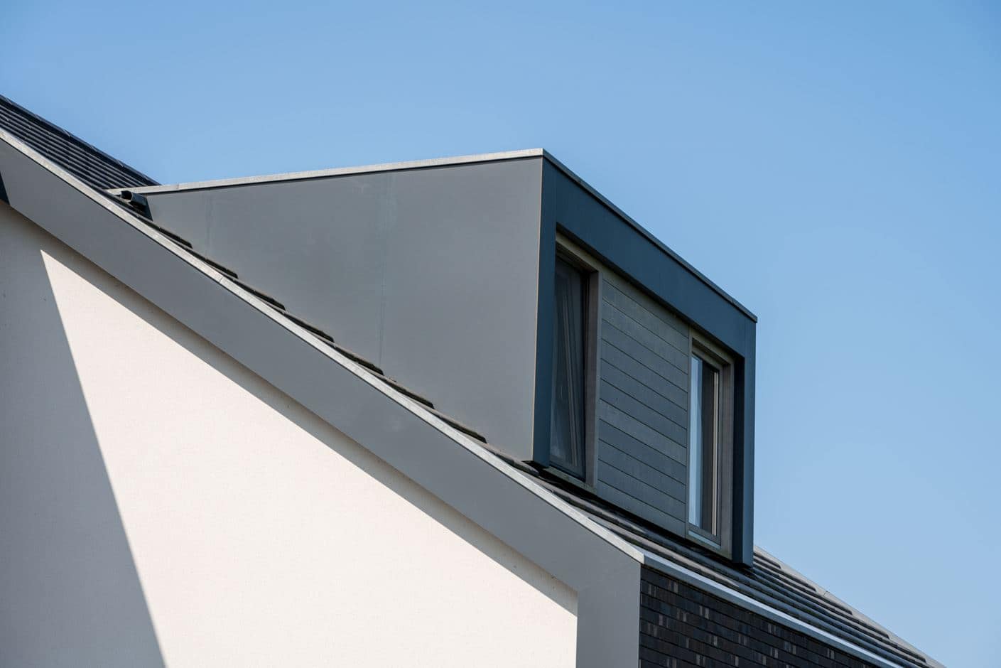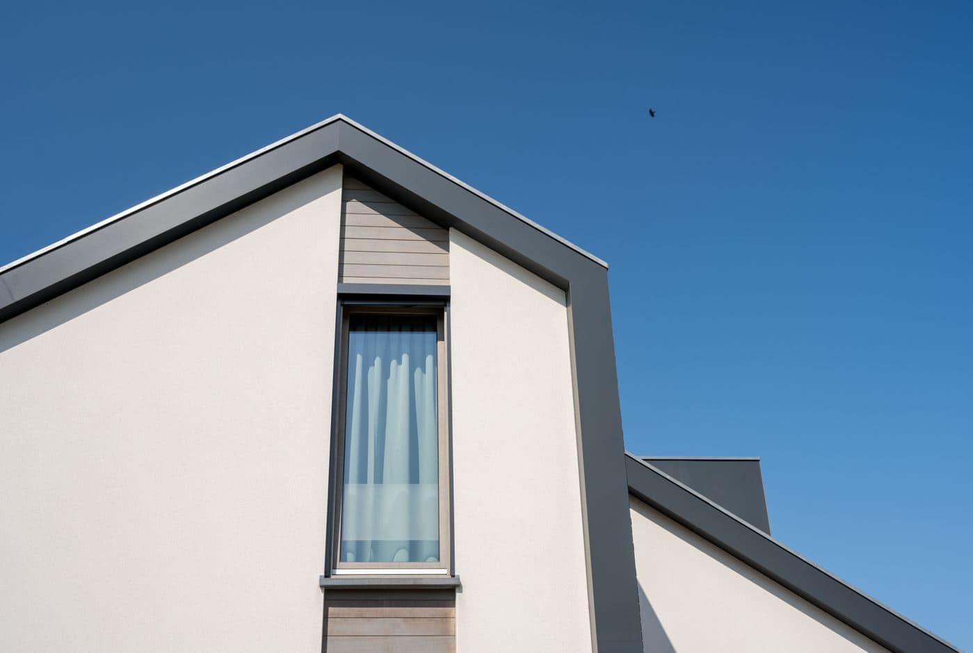 De dakranden en de dakkapel zijn afgewerkt met antracietkleurig Rockpanel. Deze duurzame en onderhoudsarme afwerking benadrukt de moderne vormentaal van de woning en zorgt voor een strak lijnenspel rondom het dak. Het antraciet vormt bovendien een krachtig contrast met de lichte gevels, wat de eigentijdse uitstraling versterkt.