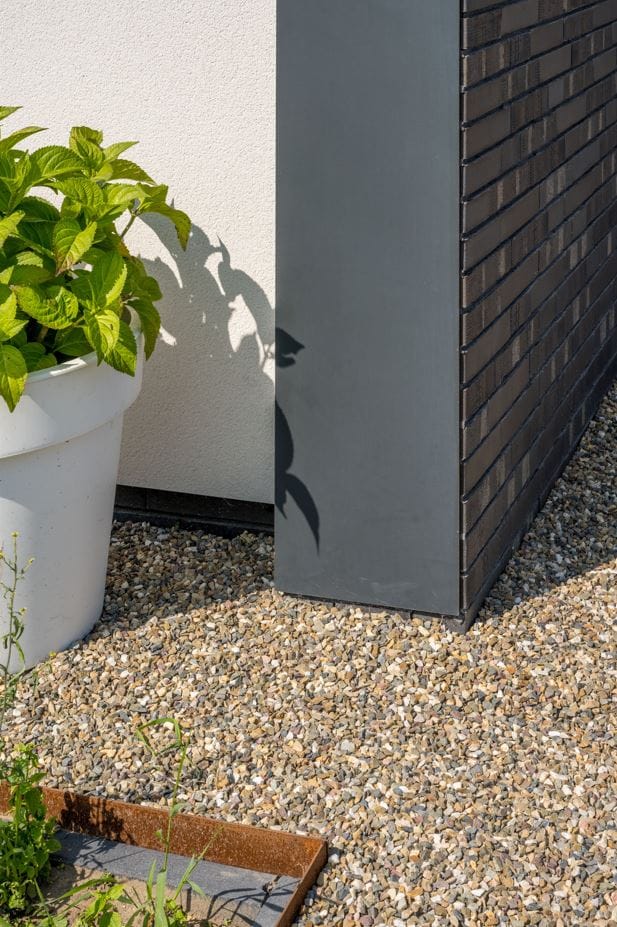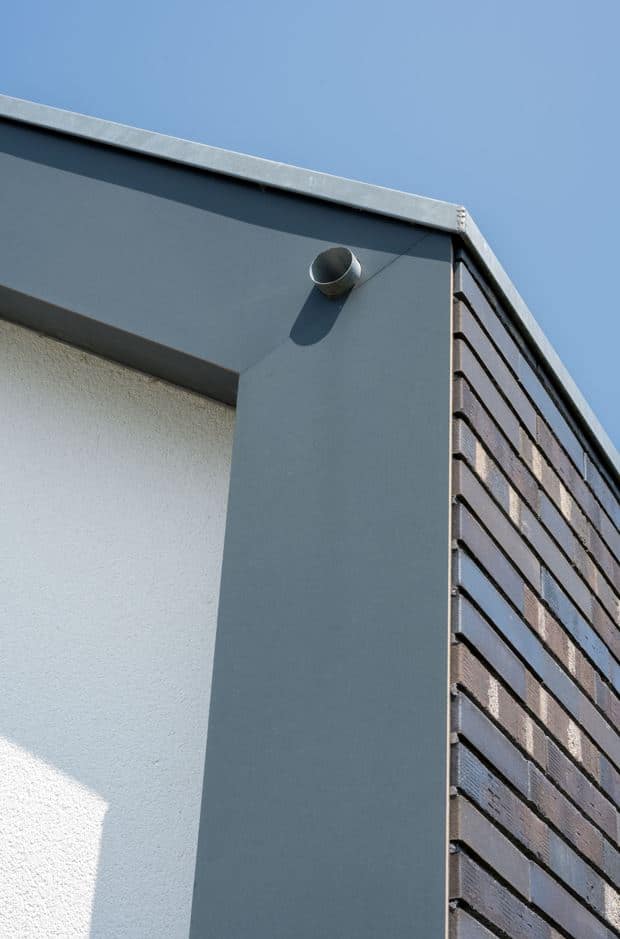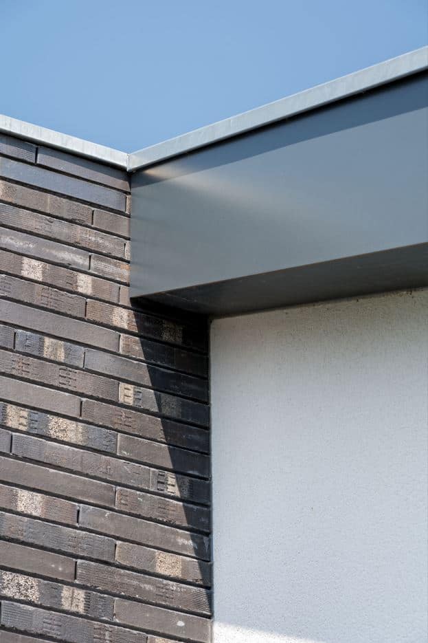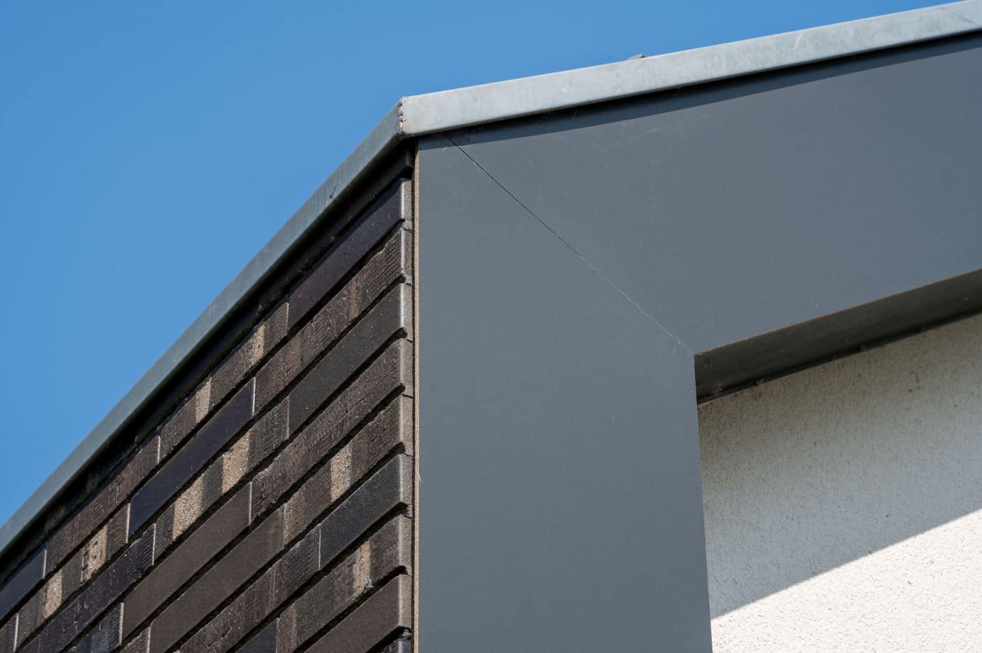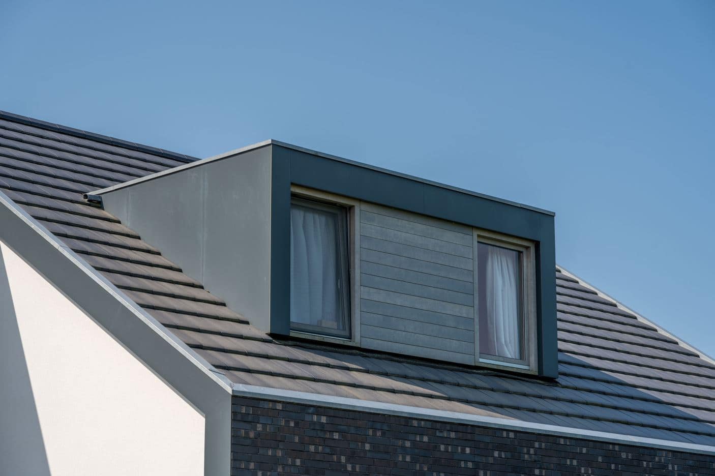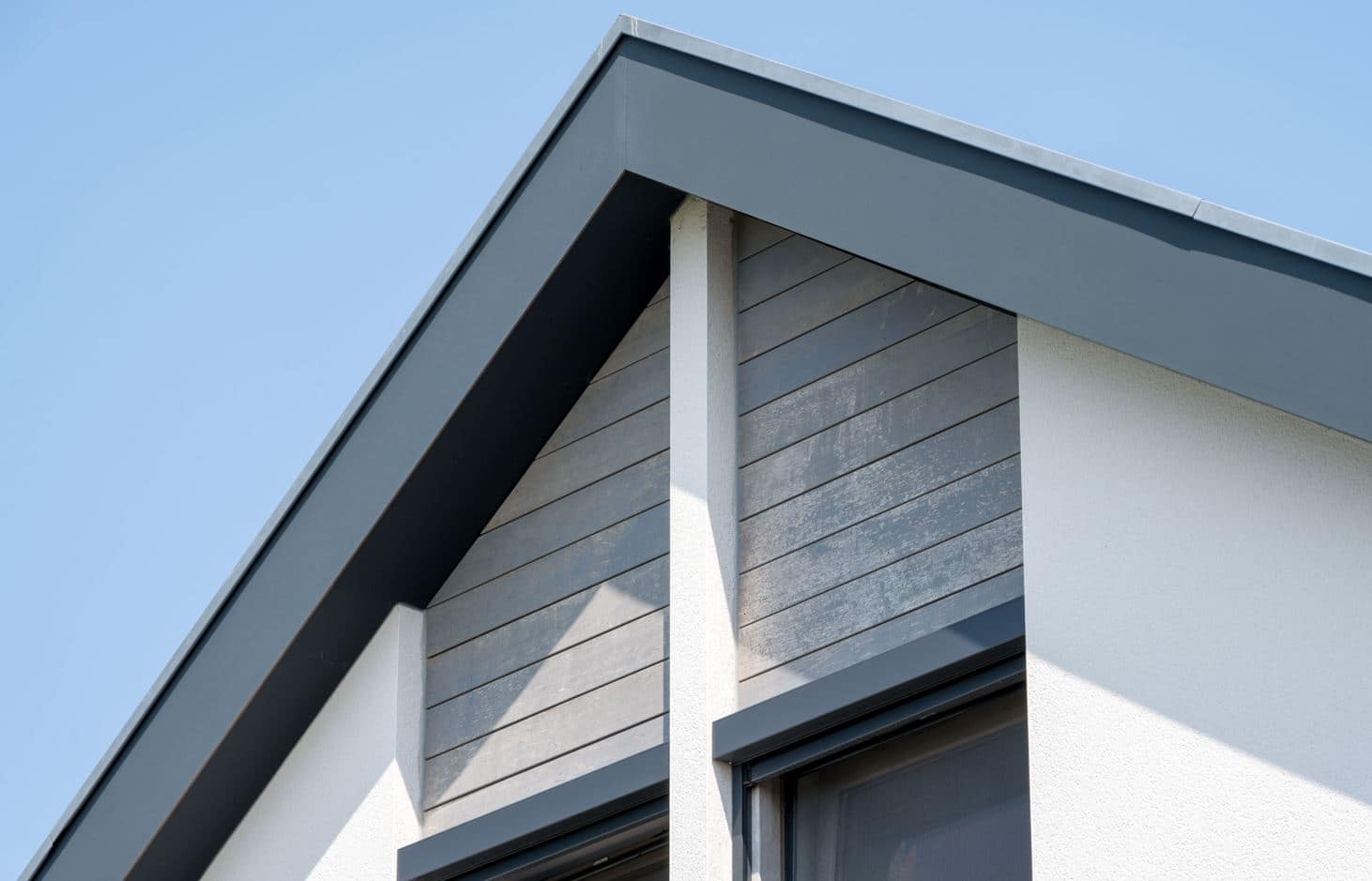 De dakranden en de dakkapel zijn afgewerkt met antracietkleurig Rockpanel. Deze duurzame en onderhoudsarme afwerking benadrukt de moderne vormentaal van de woning en zorgt voor een strak lijnenspel rondom het dak. Het antraciet vormt bovendien een krachtig contrast met de lichte gevels, wat de eigentijdse uitstraling versterkt.