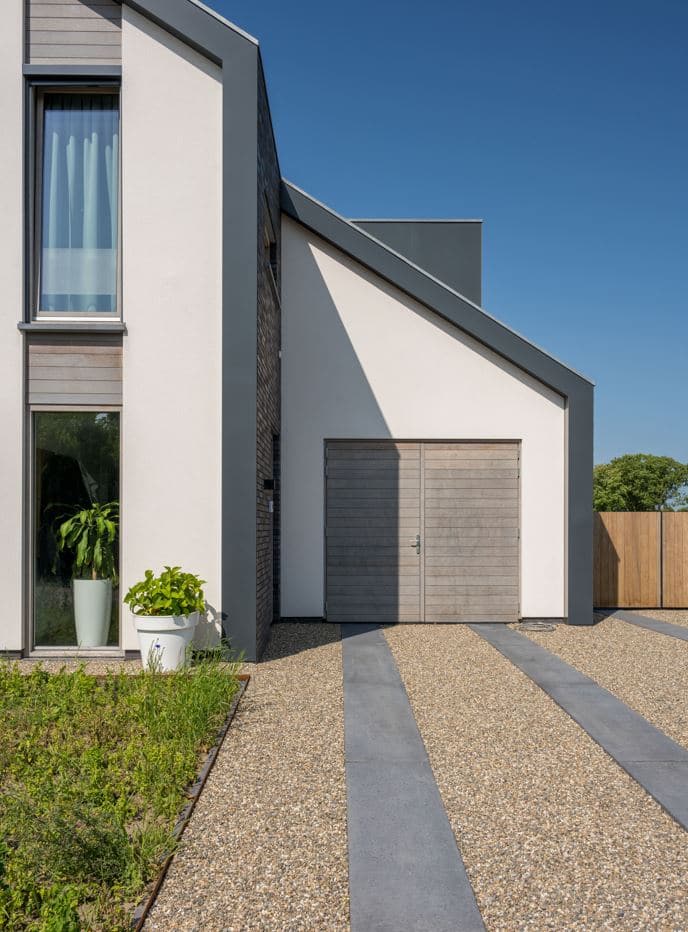 Het ontwerp kenmerkt zich door een duidelijke hoofdvorm waarbij de garage verdiept is uitgevoerd. Deze slimme ingreep zorgt ervoor dat de aandacht automatisch wordt getrokken naar de hoofdbouw. De verspringende volumes geven de woning niet alleen een dynamische uitstraling, maar versterken ook het ruimtelijk gevoel. Hierdoor ontstaat een eigentijds woonhuis dat rust, evenwicht en karakter uitstraalt.
