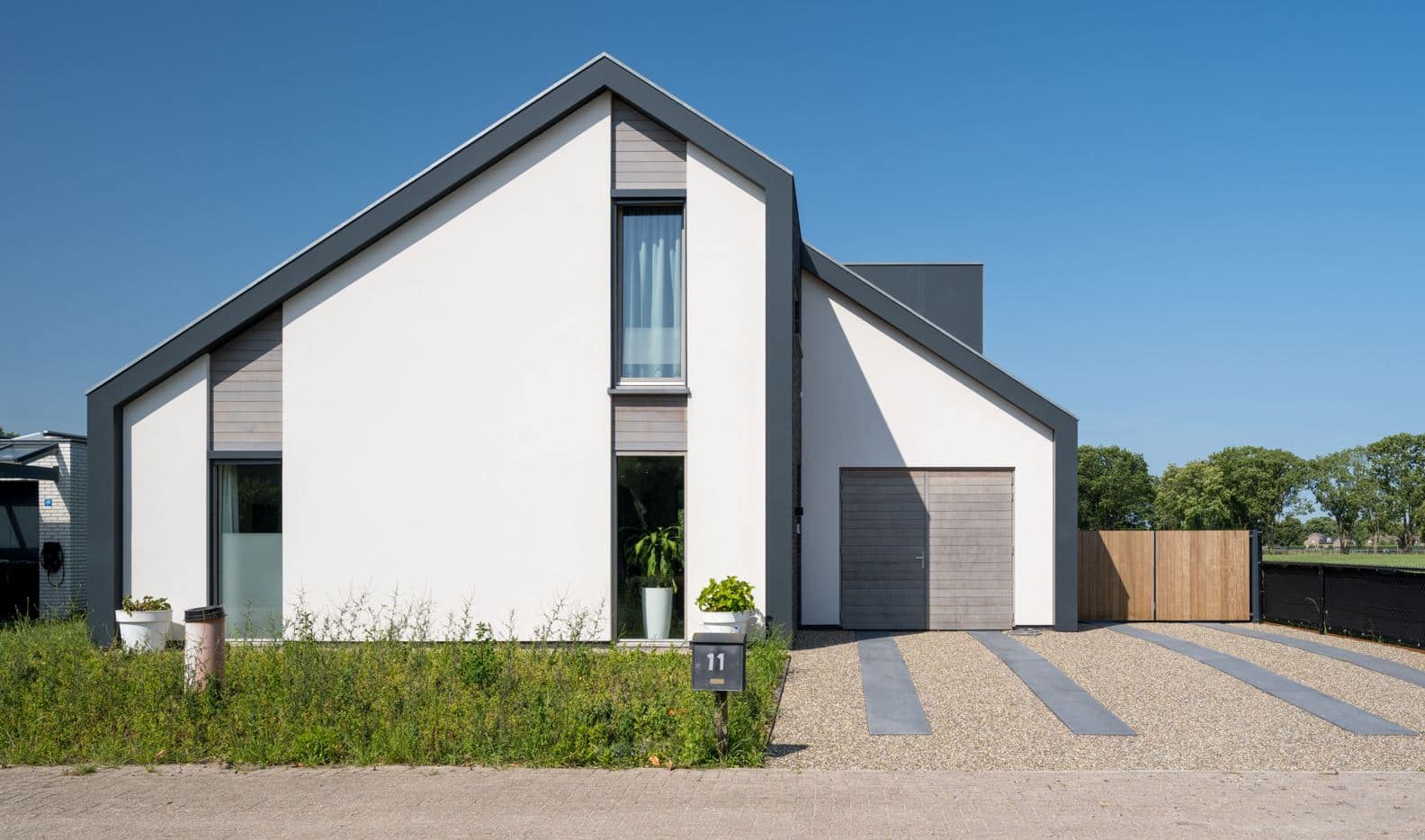 De voor- en achtergevel zijn uitgevoerd in wit stucwerk, wat zorgt voor een frisse en moderne basis. Tussen de ramen is gekozen voor een verfijnd detail van houten latten die dezelfde kleur hebben als de houten kozijnen. Dit zorgt voor een subtiele, natuurlijke verbinding tussen de verschillende gevelvlakken. Het contrast tussen het witte stucwerk en het warme hout zorgt voor een elegante en uitnodigende uitstraling.