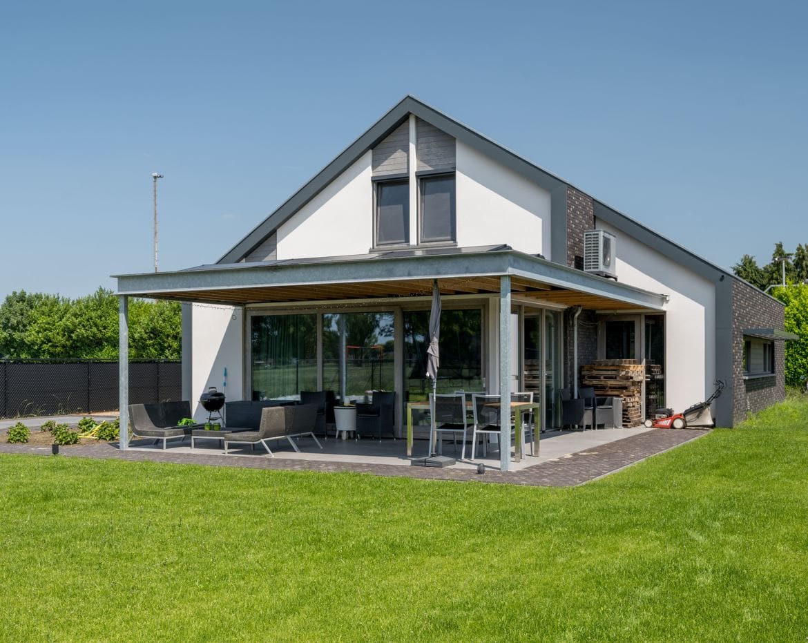 Aan de achterzijde bevindt zich een royale overkapping met een robuuste vormgeving. Deze is opgebouwd uit stevige draagbalken die bewust in het zicht zijn gelaten. Dit detail geeft de overkapping een stoer karakter en creëert een fijne buitenruimte die direct aansluit op de leefruimte binnen.