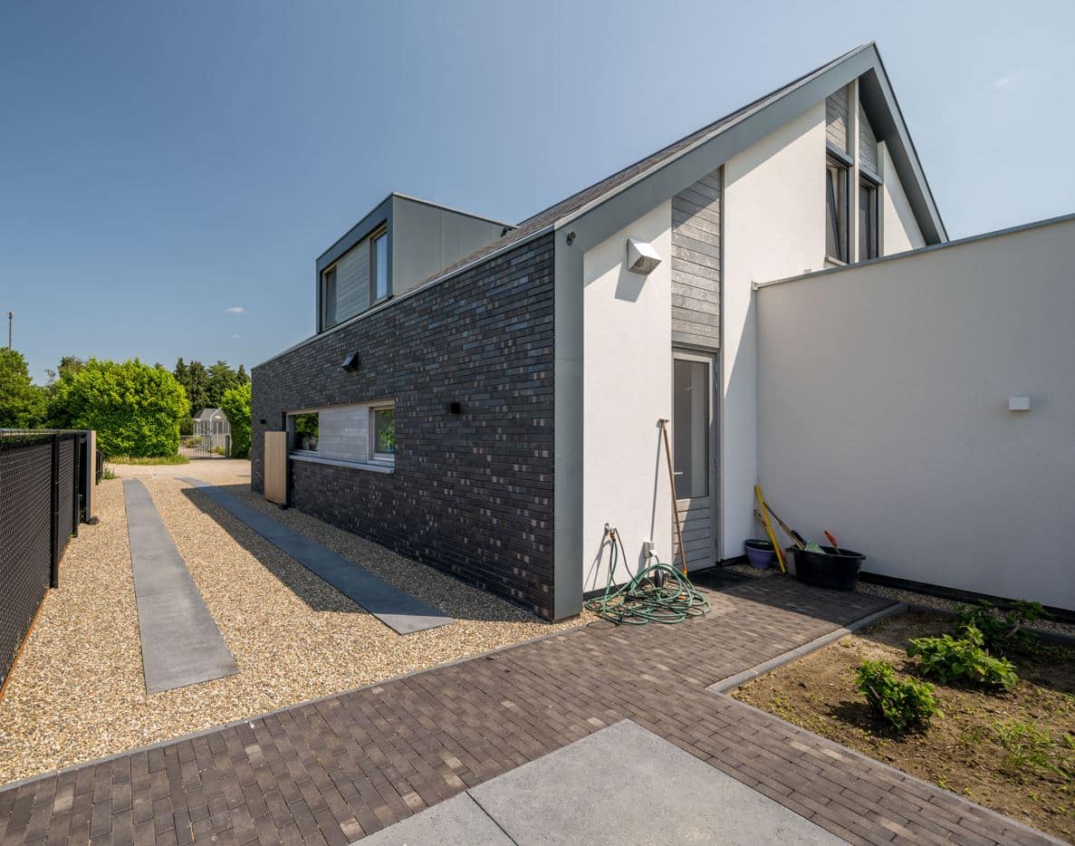 De zijgevels zijn uitgevoerd in metselwerk waarbij een steen met verschillende kleurtonen is toegepast. De combinatie van licht- en donkerbruine tinten zorgt voor een levendig gevelbeeld met een warme, natuurlijke uitstraling. Dit metselwerk vormt een mooi tegenwicht voor het strakke wit van de hoofdgevels, waardoor het geheel in balans blijft.