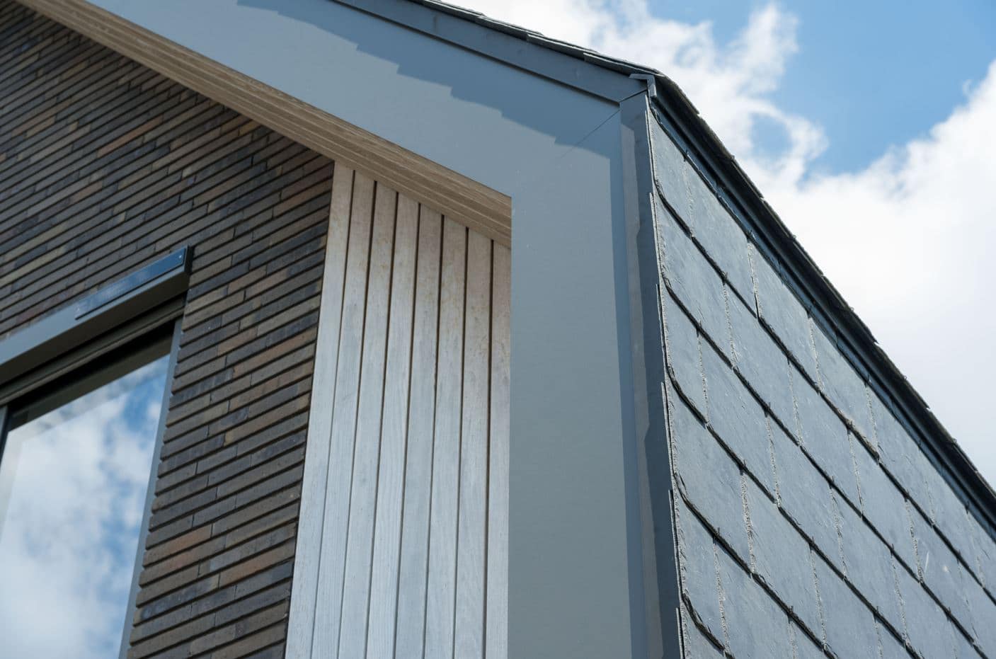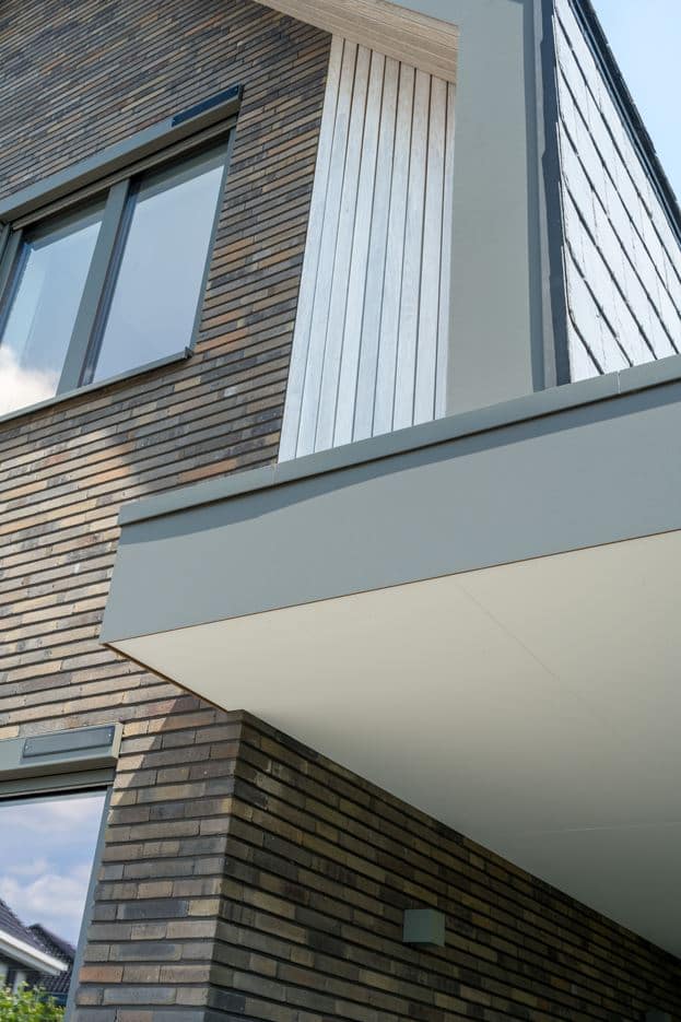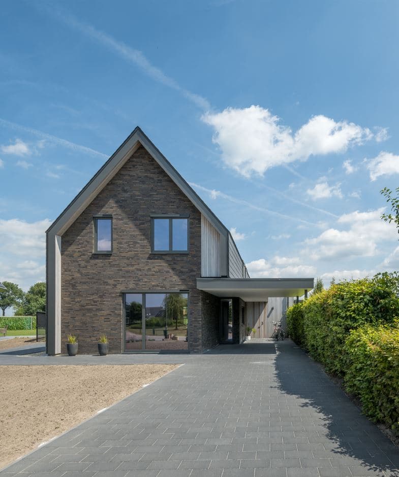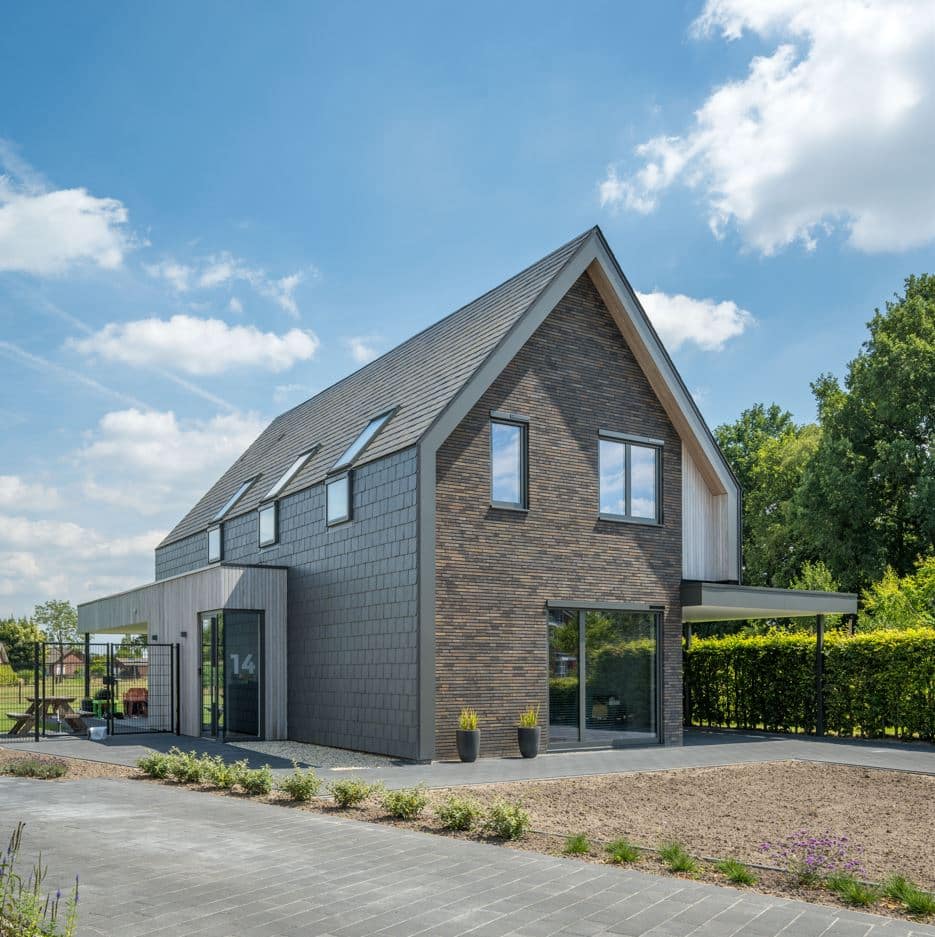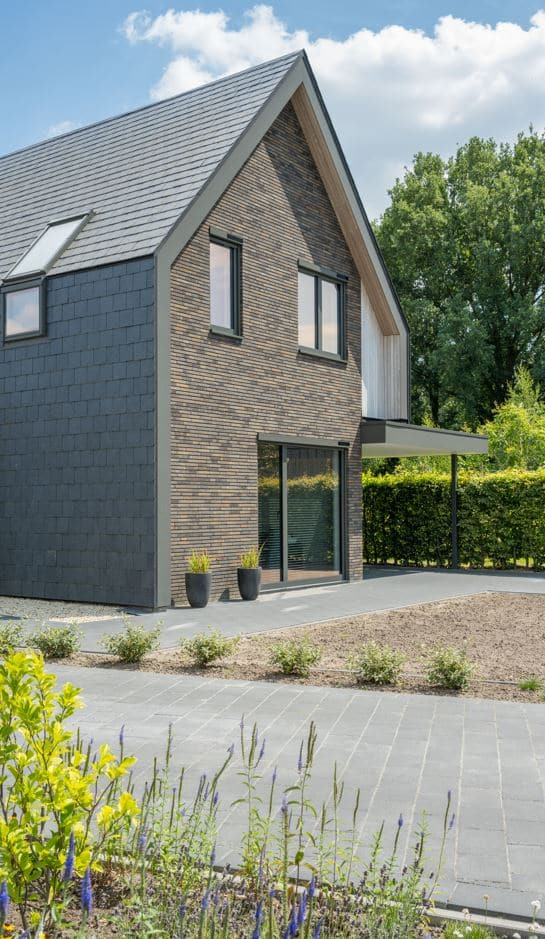 Een bijzonder kenmerk van dit project is het dak, dat is bedekt met natuursteen leien. Deze leien lopen door op de gevels, wat zorgt voor een naadloze overgang tussen dak en gevel, en een unieke, eigentijdse uitstraling. Dit materiaal is niet alleen esthetisch aantrekkelijk, maar ook duurzaam en onderhoudsarm, wat bijdraagt aan de lange levensduur van de woning.