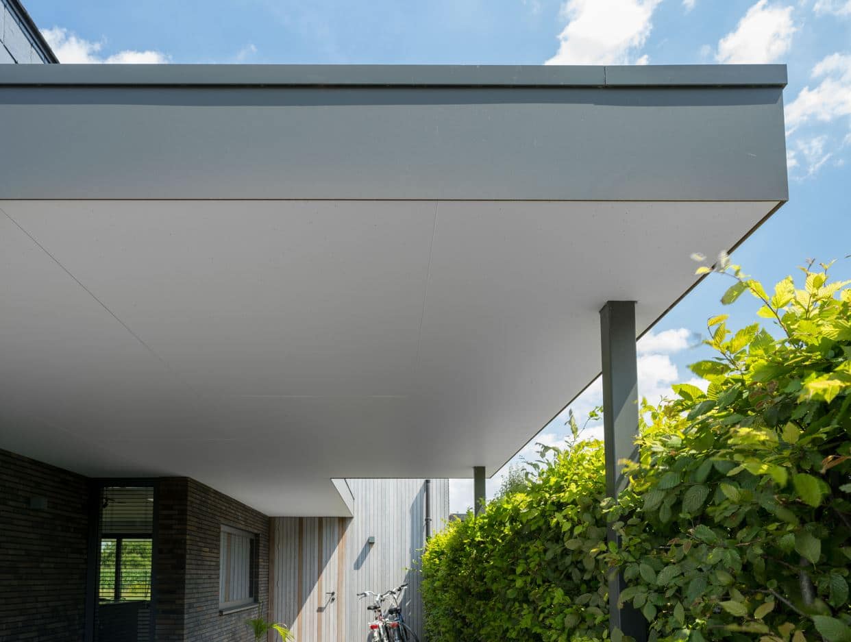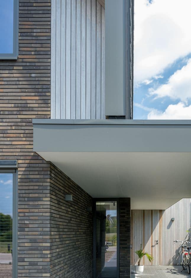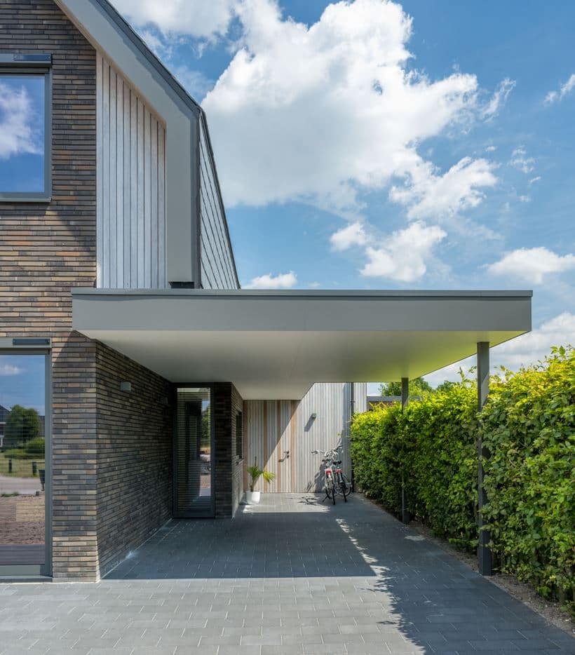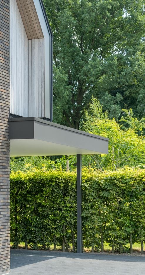 Een bijzonder kenmerk van dit project is het dak, dat is bedekt met natuursteen leien. Deze leien lopen door op de gevels, wat zorgt voor een naadloze overgang tussen dak en gevel, en een unieke, eigentijdse uitstraling. Dit materiaal is niet alleen esthetisch aantrekkelijk, maar ook duurzaam en onderhoudsarm, wat bijdraagt aan de lange levensduur van de woning.