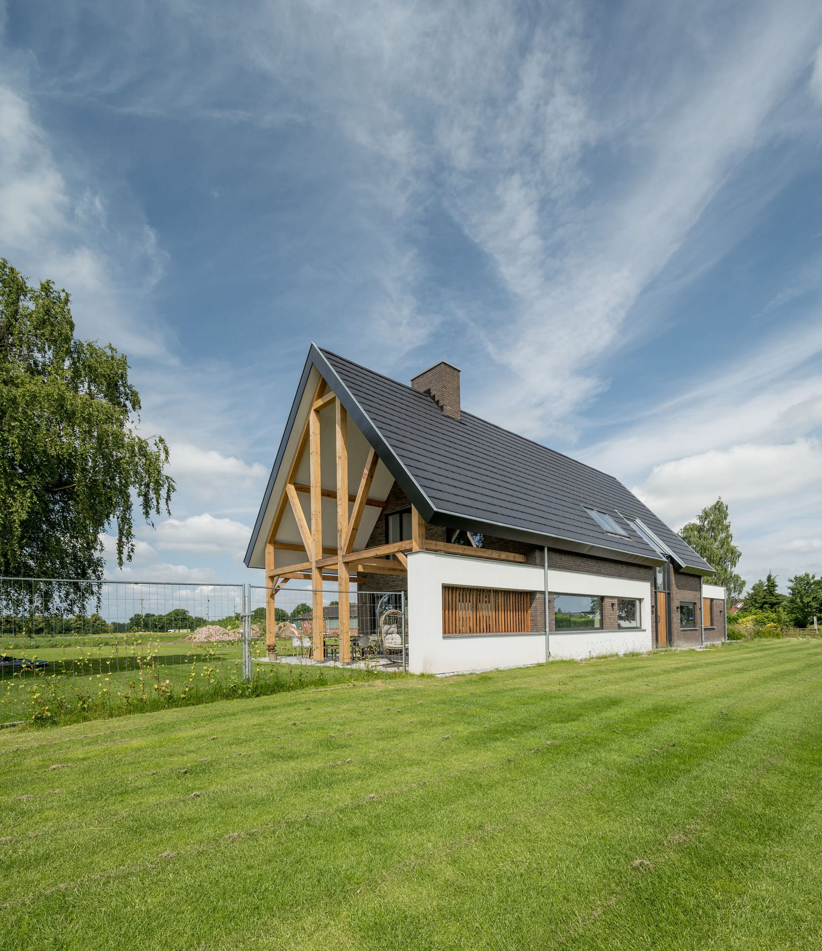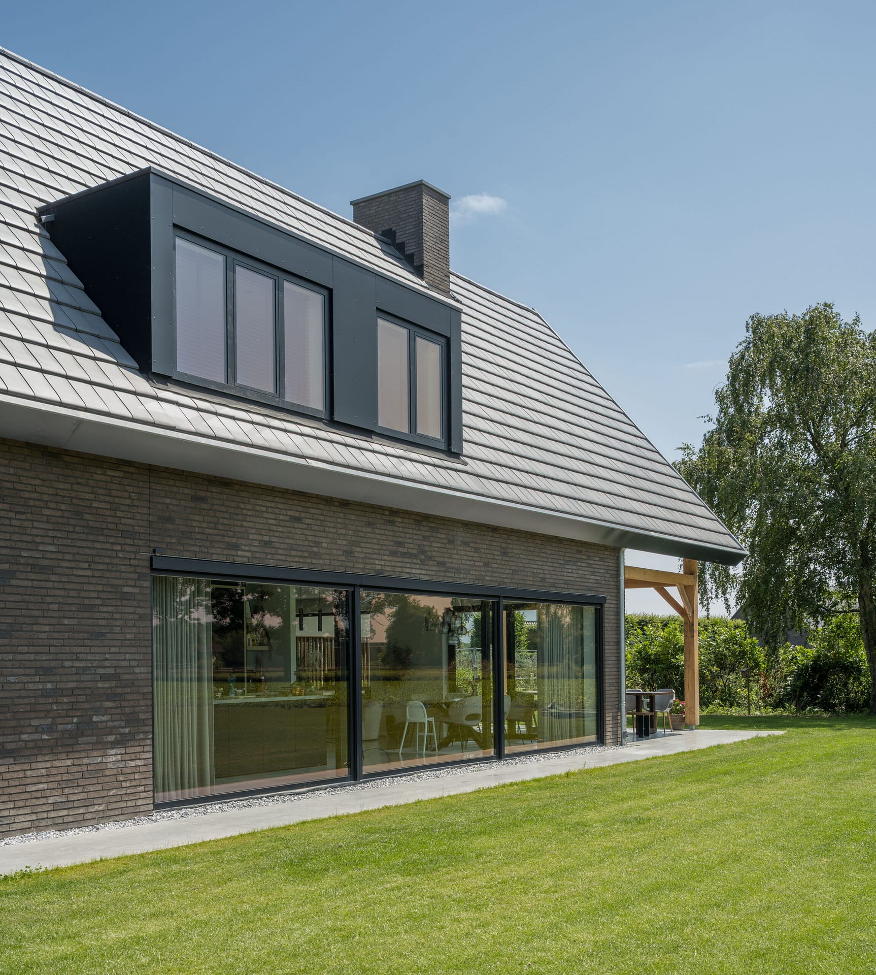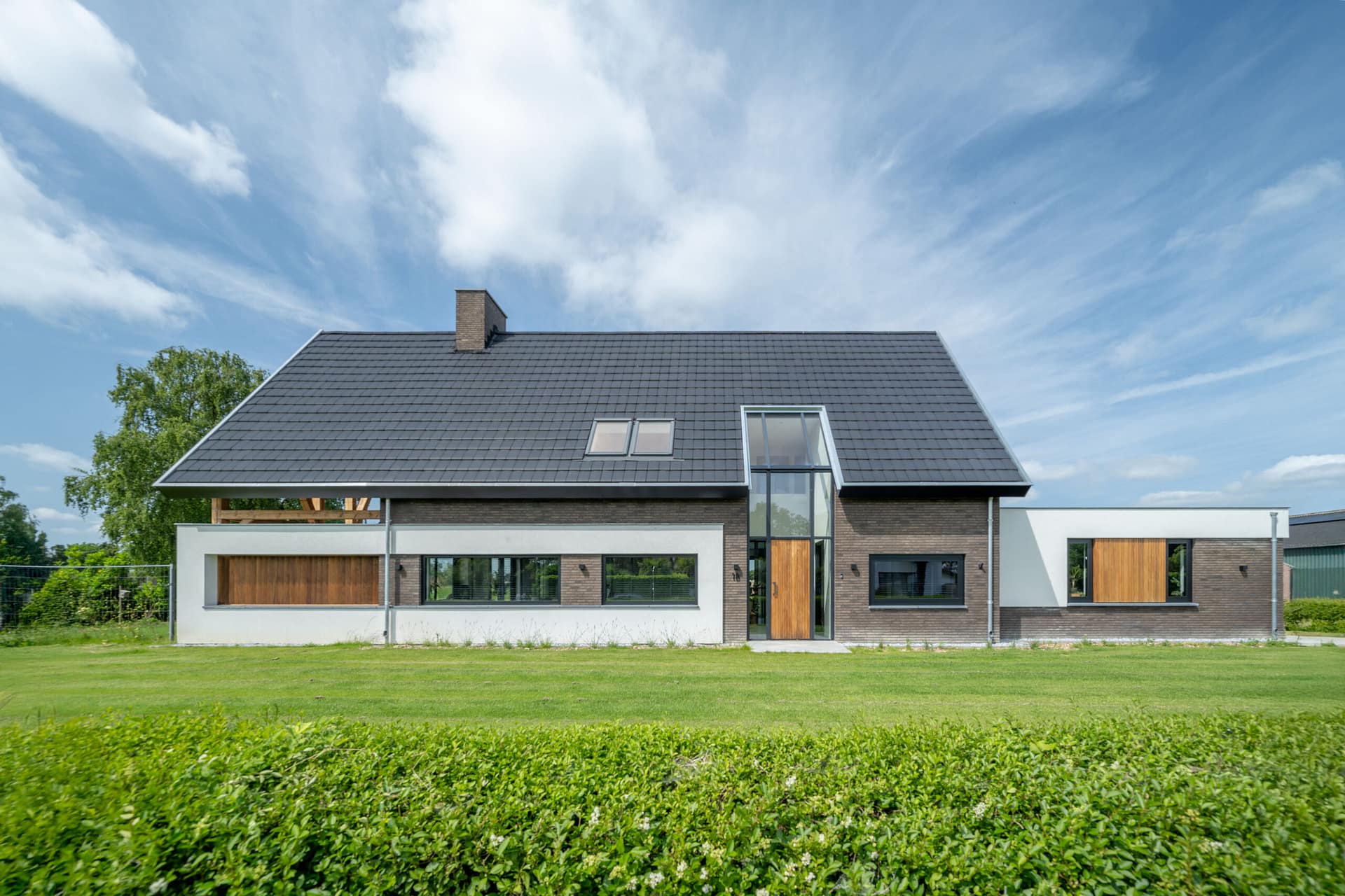 De schoorsteen breekt de lange gevel en zorgt voor extra dynamiek in het geheel. De woning wordt afgewerkt met strakke dakranden, een zinken lijst en dakpannen die strak in het dakvlak zijn verwerkt. Deze combinatie van materialen en vormen geeft de woning een moderne, maar toch landelijke uitstraling die perfect aansluit bij de omgeving.
