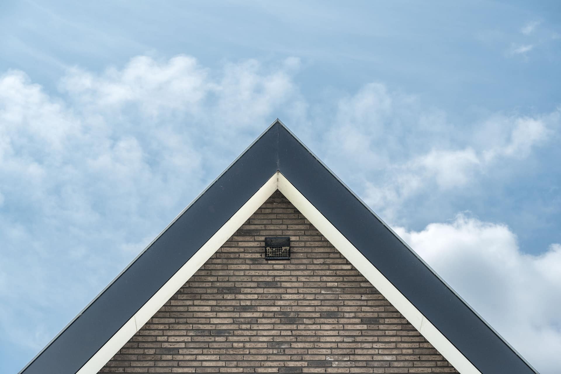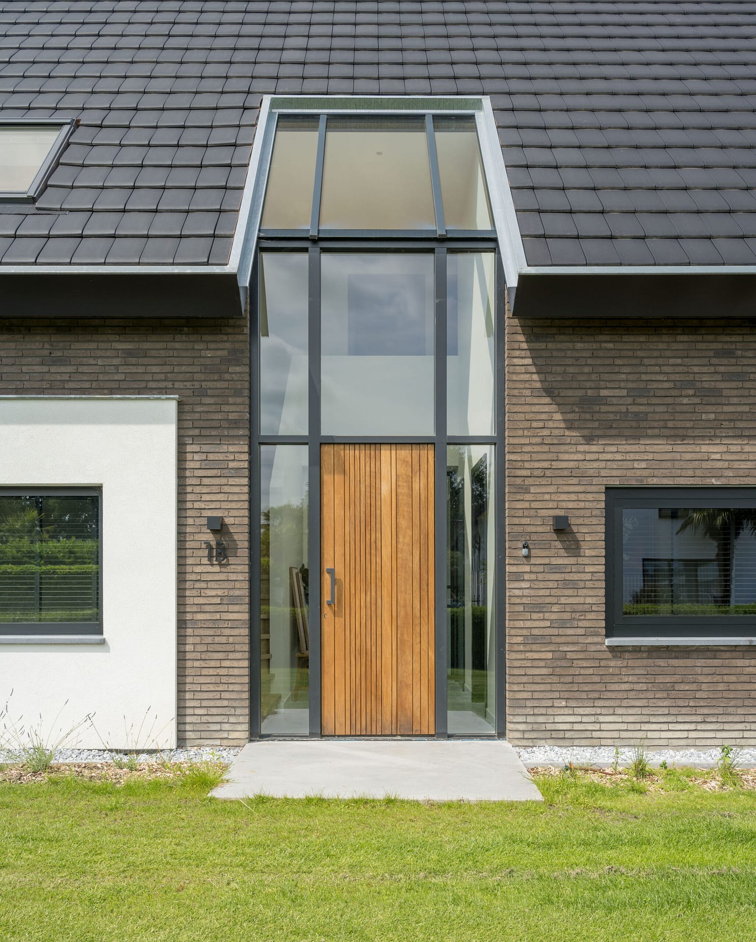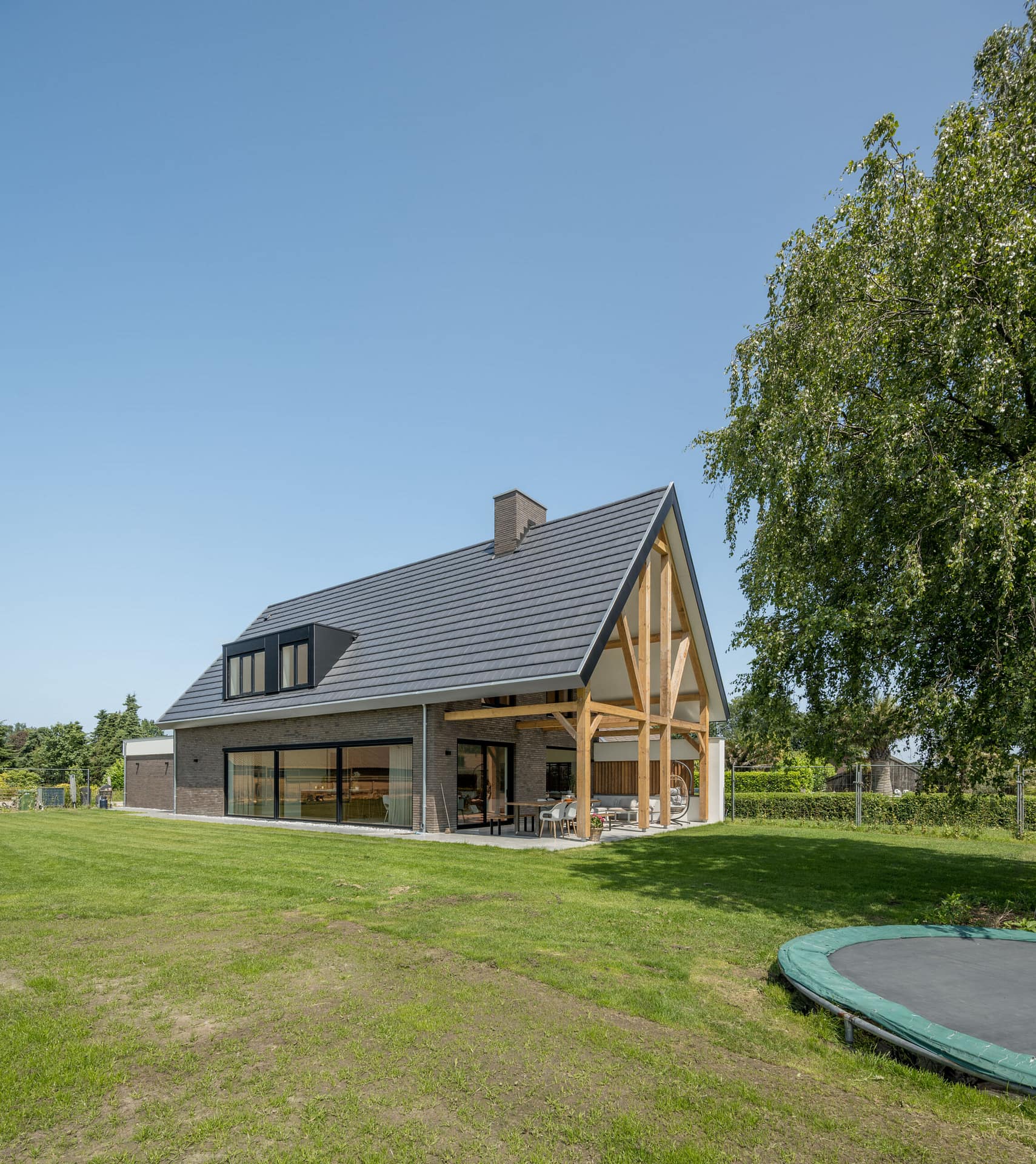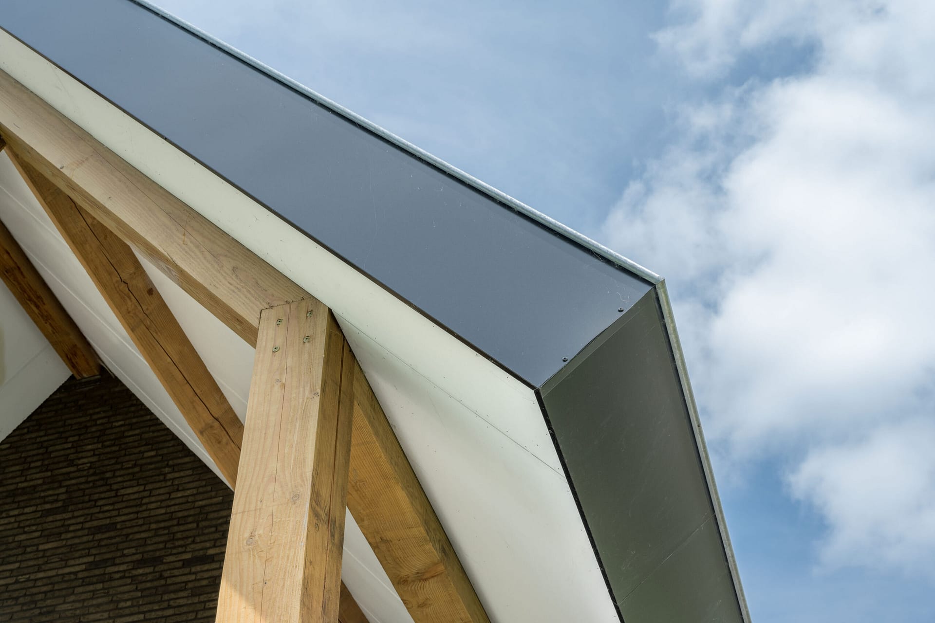 De schoorsteen breekt de lange gevel en zorgt voor extra dynamiek in het geheel. De woning wordt afgewerkt met strakke dakranden, een zinken lijst en dakpannen die strak in het dakvlak zijn verwerkt. Deze combinatie van materialen en vormen geeft de woning een moderne, maar toch landelijke uitstraling die perfect aansluit bij de omgeving.