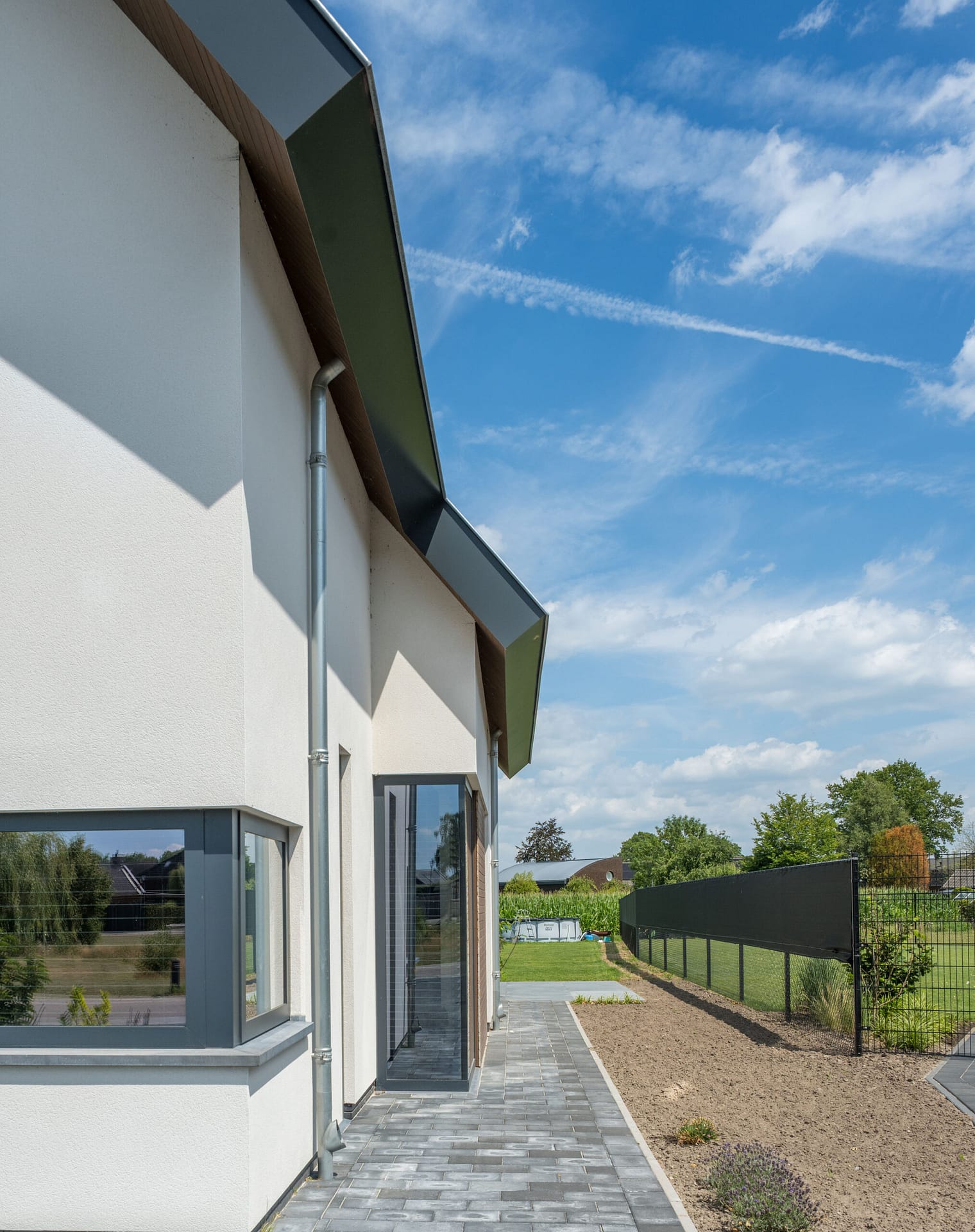 De gevels van de woning zijn uitgevoerd in wit gestucte cellenbeton (https://celbet.nl/), wat zorgt voor een frisse en moderne uitstraling. Deze strakke, lichte gevels vormen een krachtig contrast met de diepe, bijna zwarte strengpers bakstenen, die de woning een robuuste en eigentijdse uitstraling geven. Dit contrast tussen licht en donker creëert niet alleen visuele impact, maar versterkt ook de architectonische details van de woning.