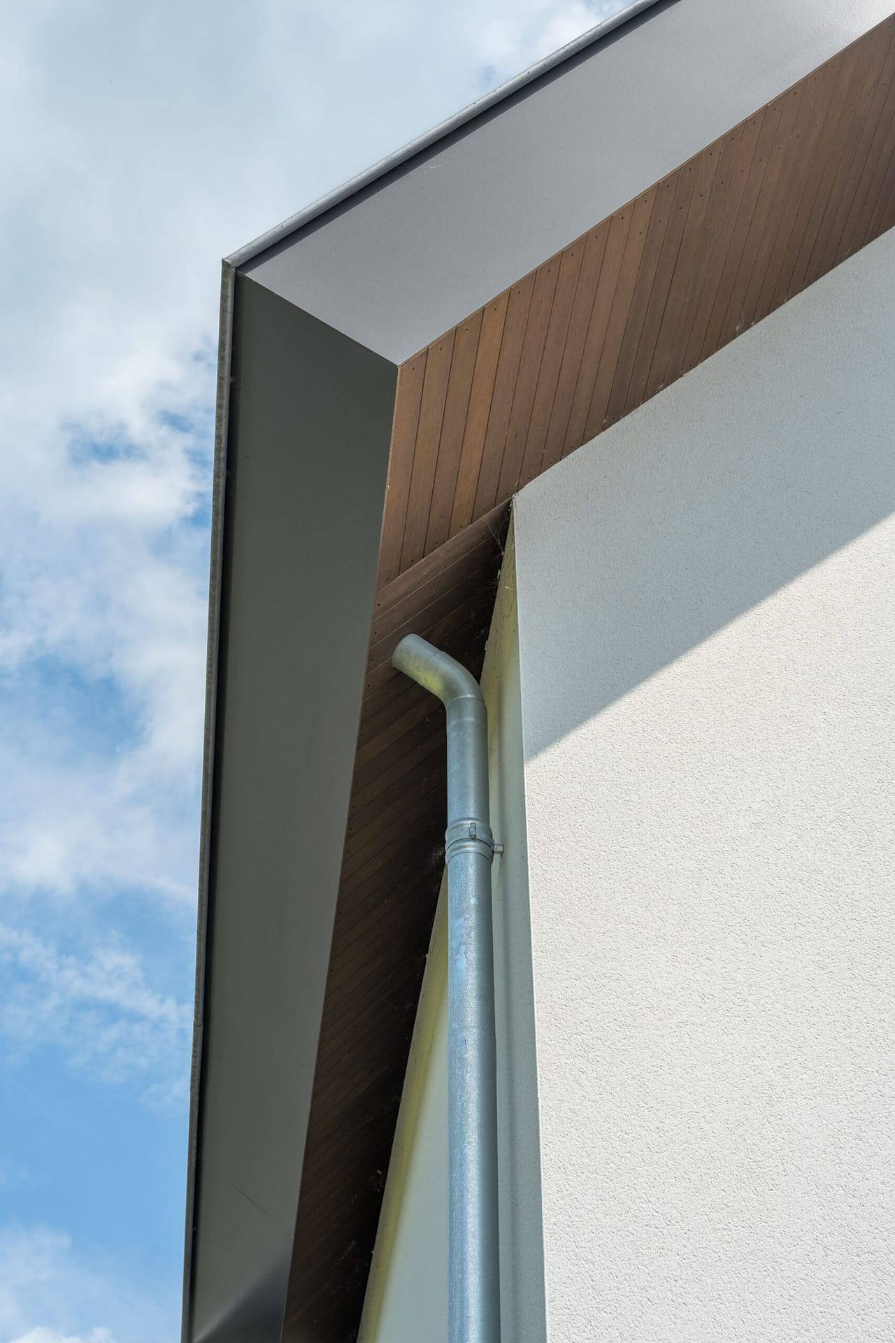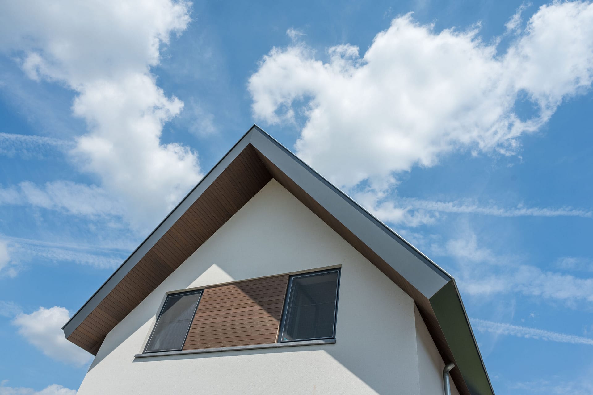 Het asymmetrisch uitlopende dak, dat is afgedekt met vlakke zwarte dakpannen, geeft de woning een dynamisch en eigentijds karakter. Dit dakontwerp benadrukt de moderne stijl van de woning, terwijl het tegelijk het gevoel van openheid en ruimte versterkt. De onderzijde van het dak is afgetimmerd met duurzaam hout, hetzelfde hout dat in de gevels is gebruikt, wat zorgt voor een harmonieuze en verfijnde afwerking.