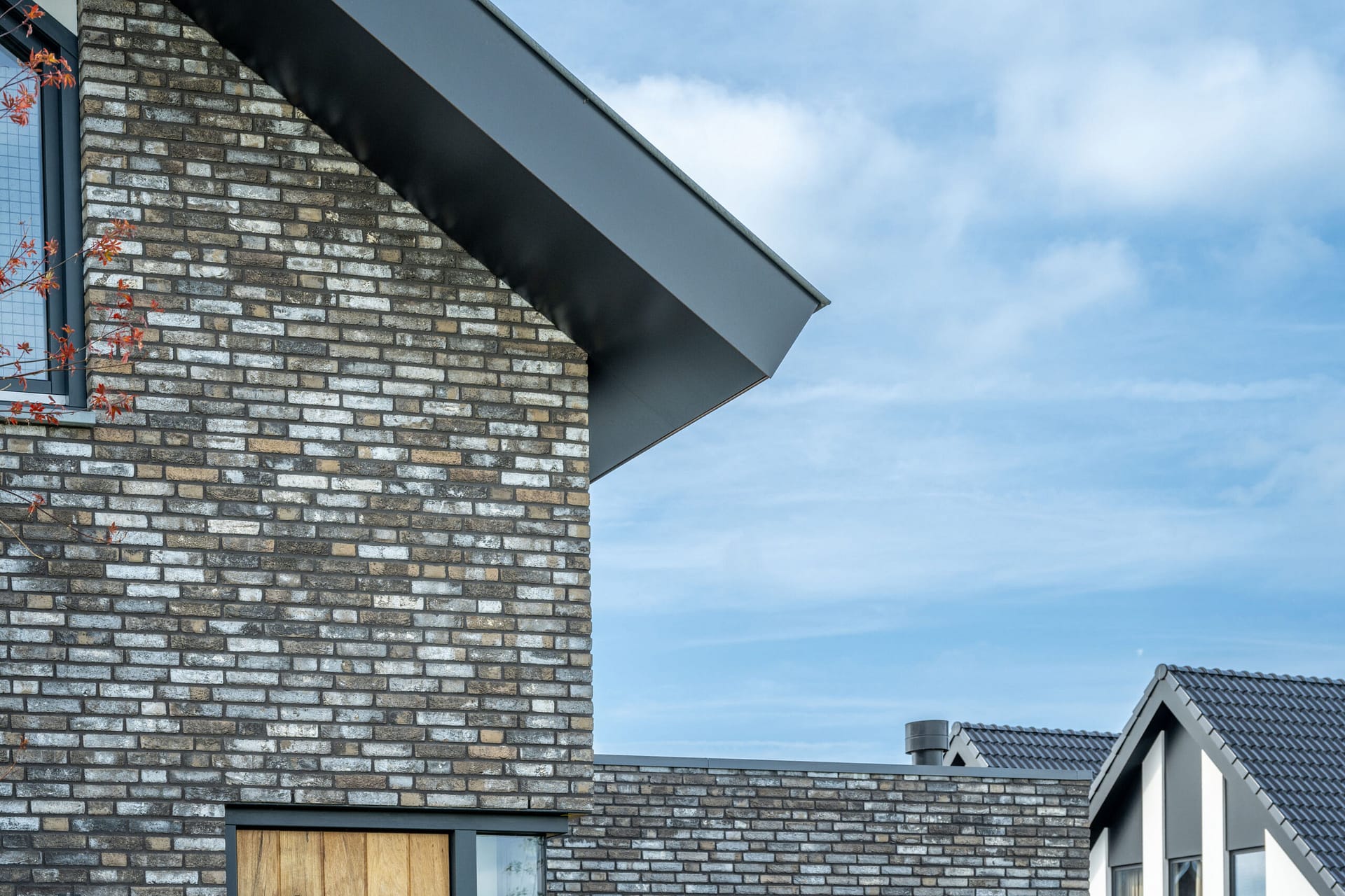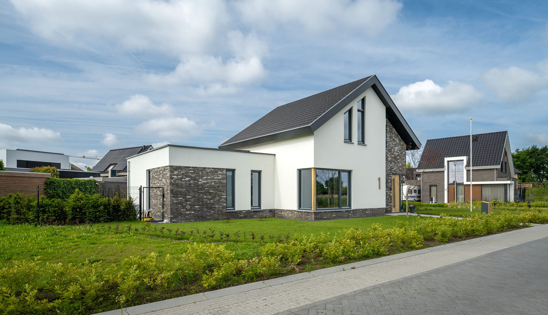 De woning kenmerkt zich door een doordachte materiaalcombinatie van stucwerk en genuanceerd metselwerk, die op diverse plekken naadloos in elkaar overvloeien. Dit zorgt niet alleen voor een eigentijds totaalbeeld, maar creëert ook een fraai spel van volumes en texturen. De gevel is bewust ontworpen met subtiele sprongen en verspringende vlakken, wat het geheel een speels en levendig karakter geeft.