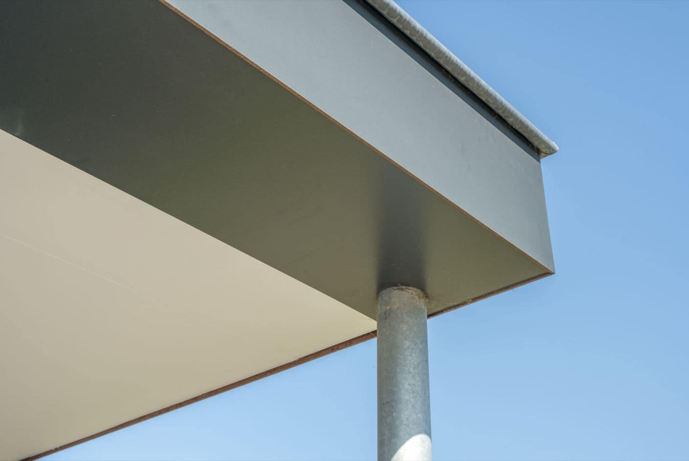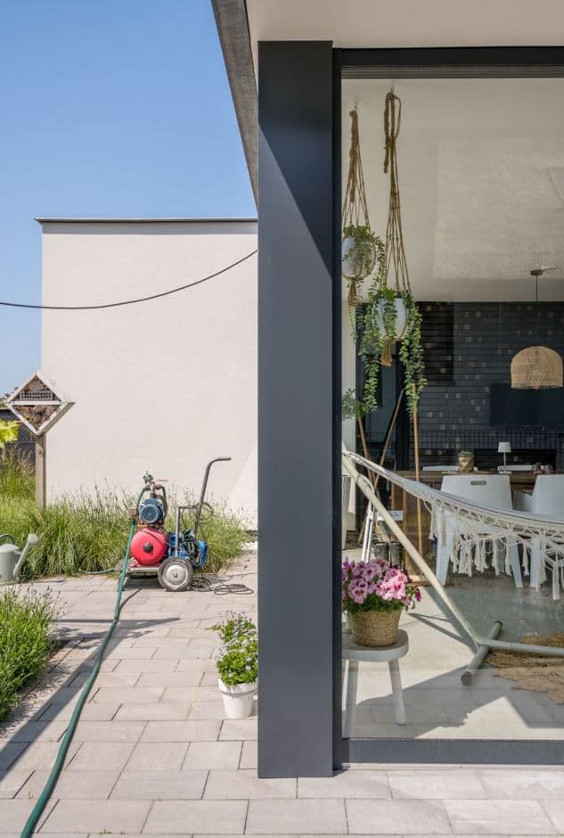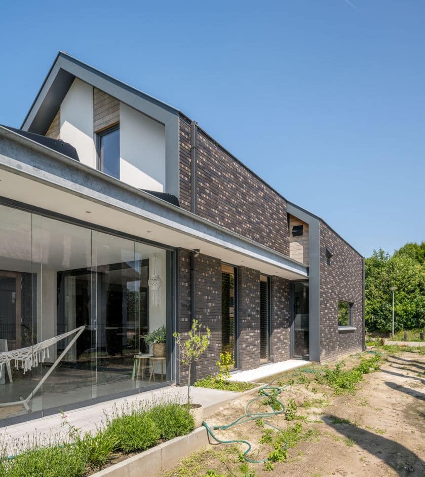 Een bijzonder architectonisch detail is de zichtbare draagbalk aan de zijkant van de woning. Door dit constructieve element bewust in het zicht te laten, krijgt de woning een stoere en robuuste uitstraling die haar onderscheidt van traditionele ontwerpen.