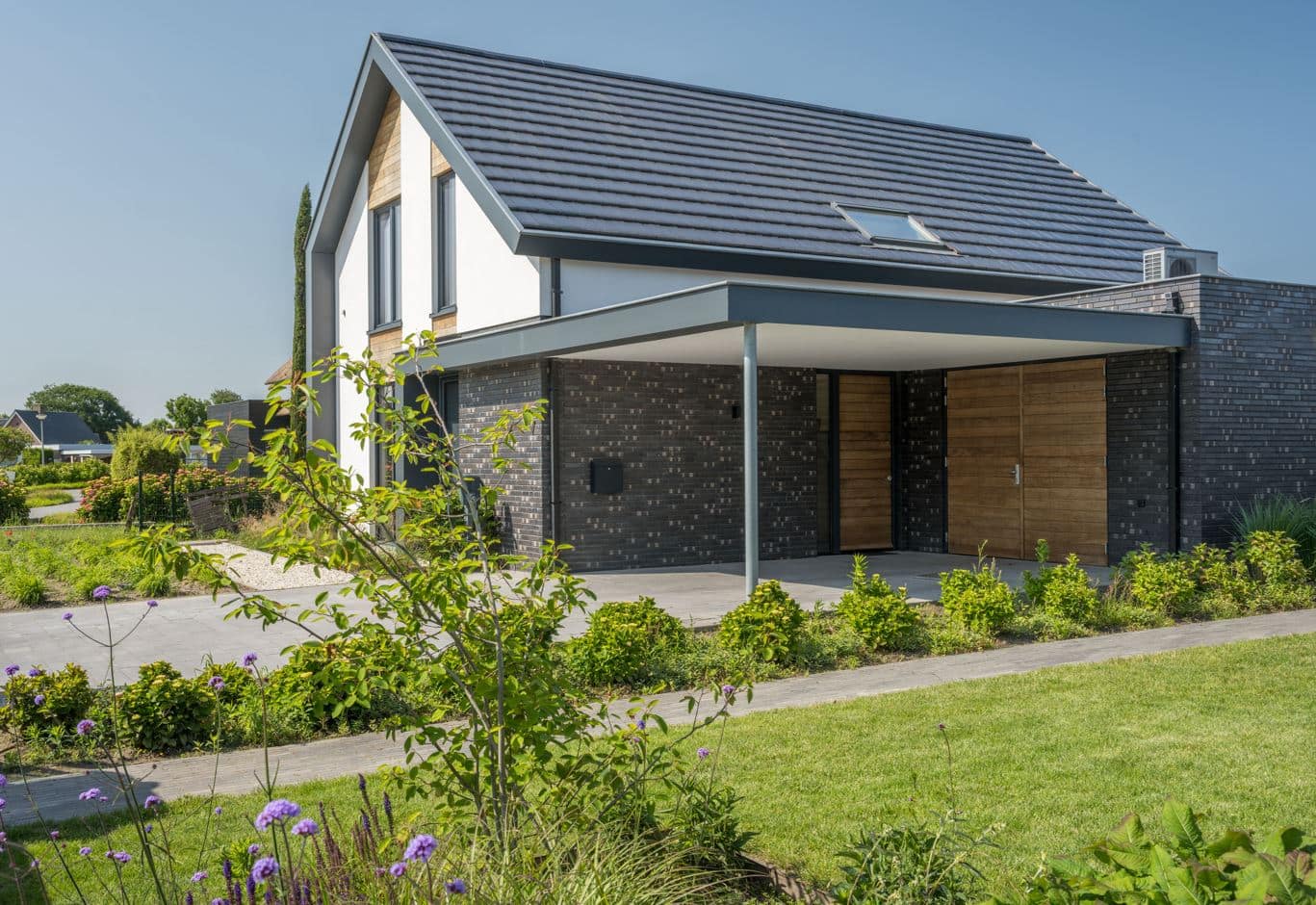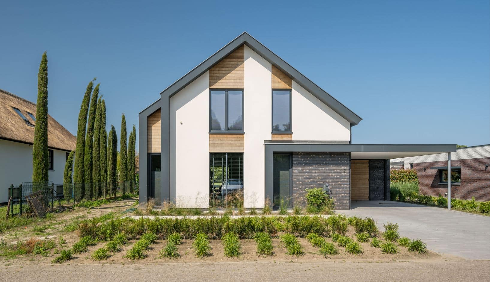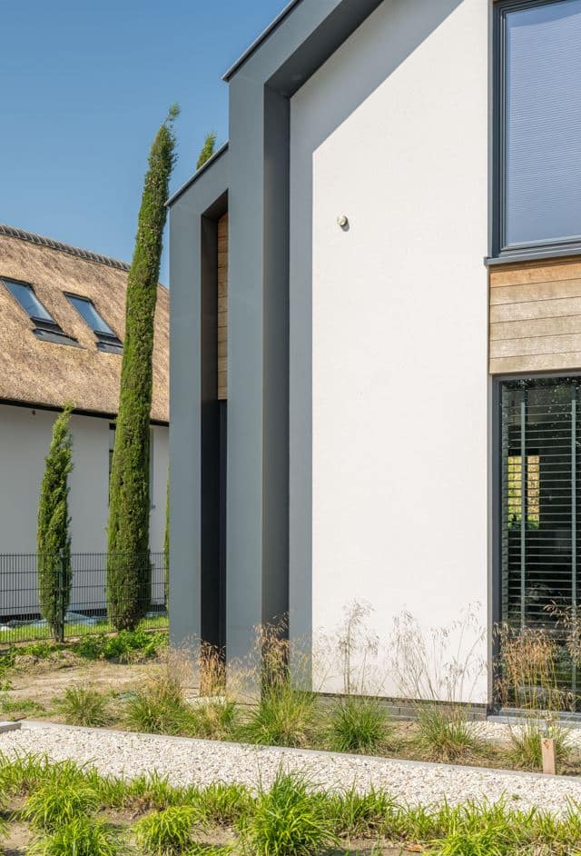 Om extra warmte en contrast toe te voegen, zijn eiken houten rabatdelen toegepast tussen de ramen, de voordeur en de garagedeur. Deze natuurlijke houtkleur vormt een fraai tegenwicht voor het moderne antraciet van de kozijnen en benadrukt de zorgvuldige detaillering van het ontwerp.