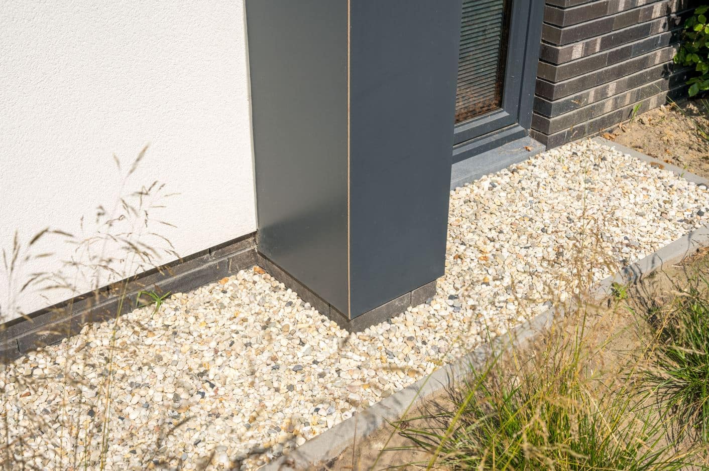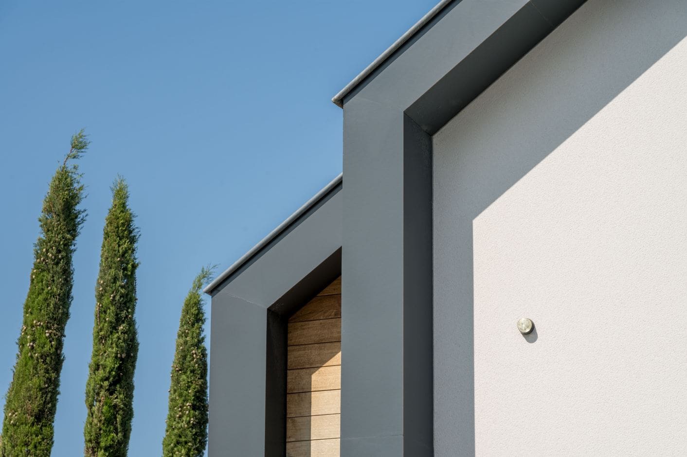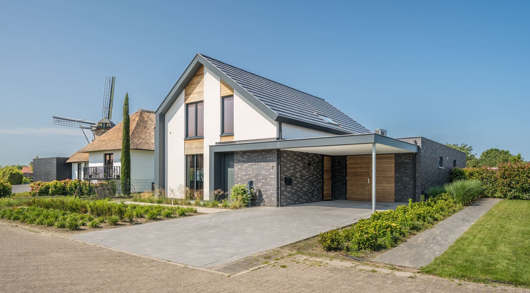 Om extra warmte en contrast toe te voegen, zijn eiken houten rabatdelen toegepast tussen de ramen, de voordeur en de garagedeur. Deze natuurlijke houtkleur vormt een fraai tegenwicht voor het moderne antraciet van de kozijnen en benadrukt de zorgvuldige detaillering van het ontwerp.