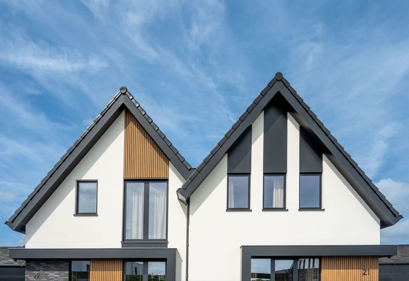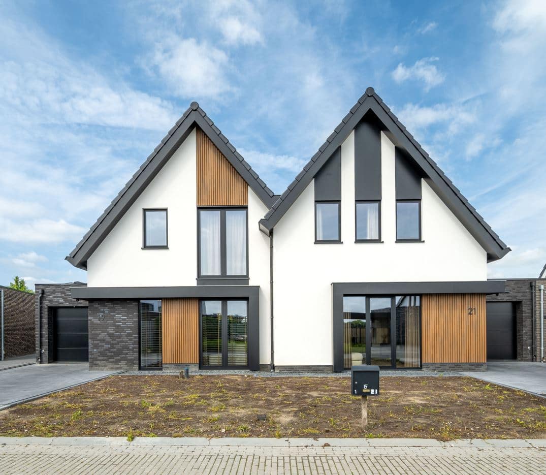Deze twee-onder-een-kapwoning is een bijzonder voorbeeld van hoe materiaalgebruik en vormgeving in harmonie kunnen samenkomen. Het ontwerp kenmerkt zich door een eigentijdse, warme uitstraling waarbij elk detail zorgvuldig is overwogen. De combinatie van grijze gemêleerde gevelsteen, houten gevelafwerking en antracietkleurige kozijnen zorgt voor een krachtig contrast dat zowel modern als natuurlijk oogt.