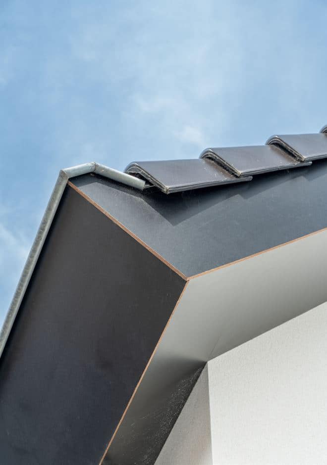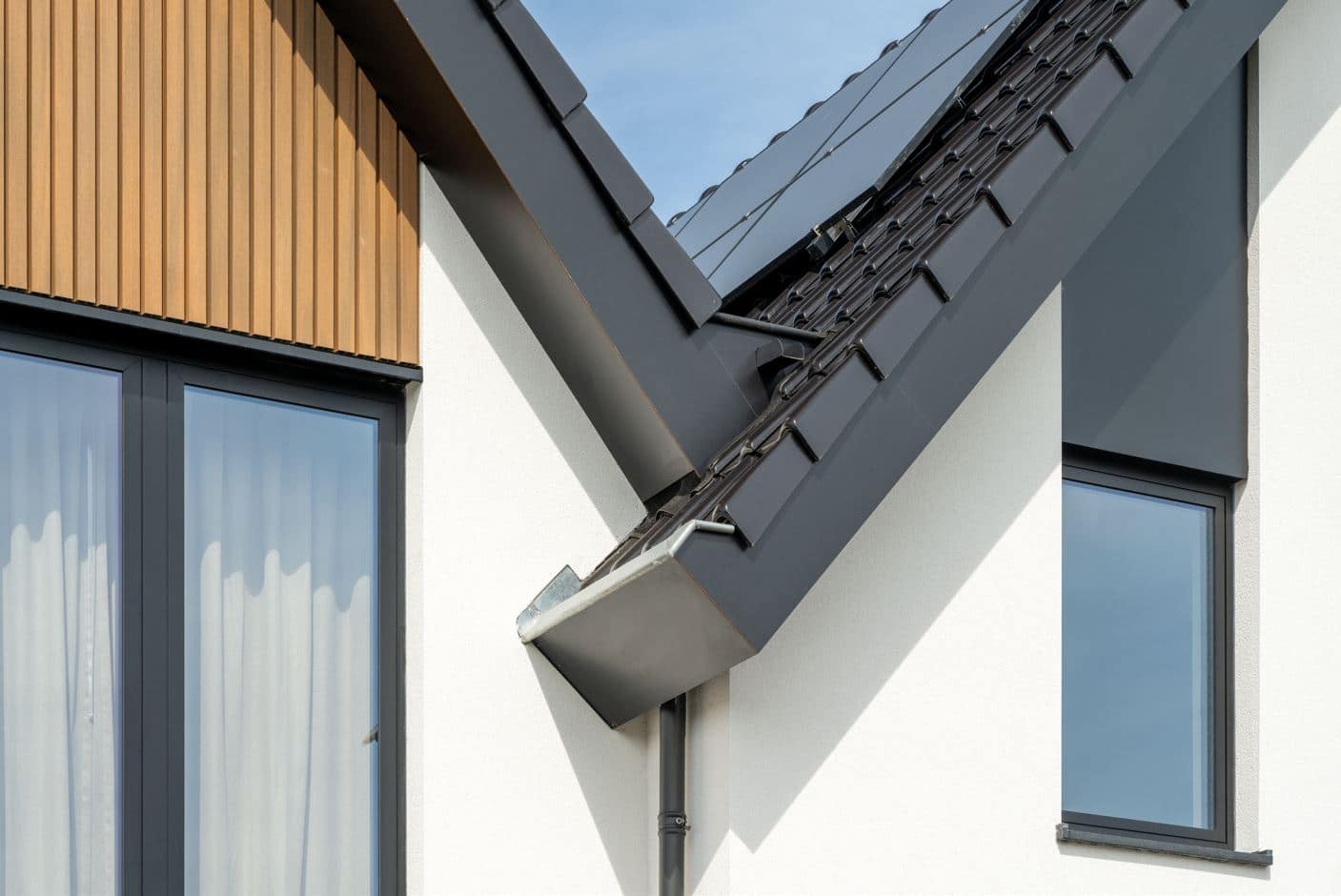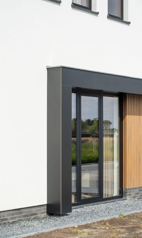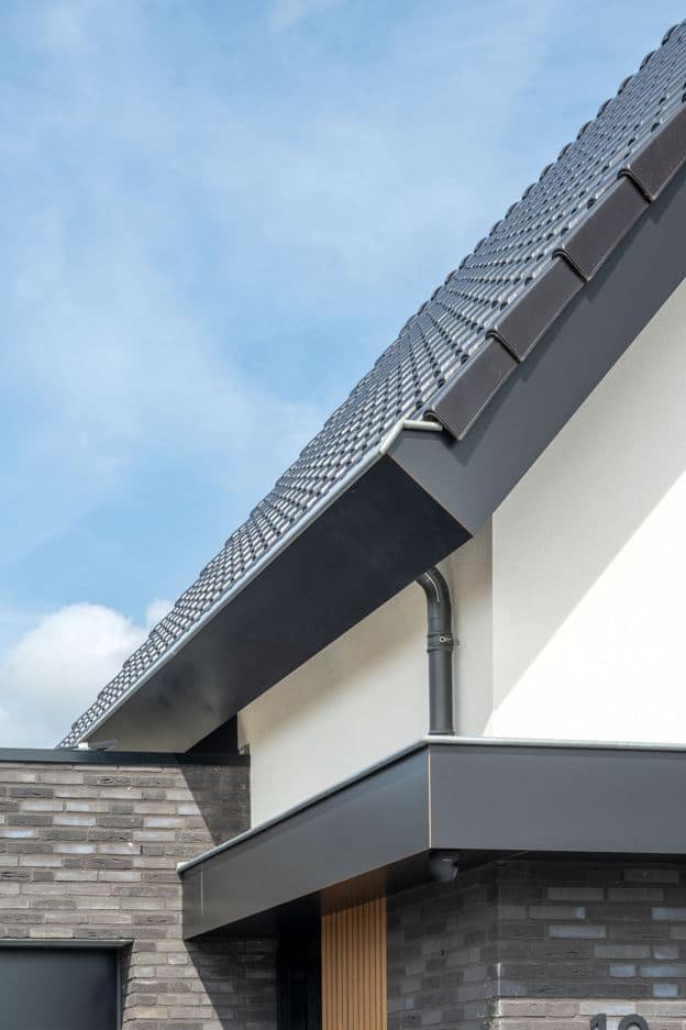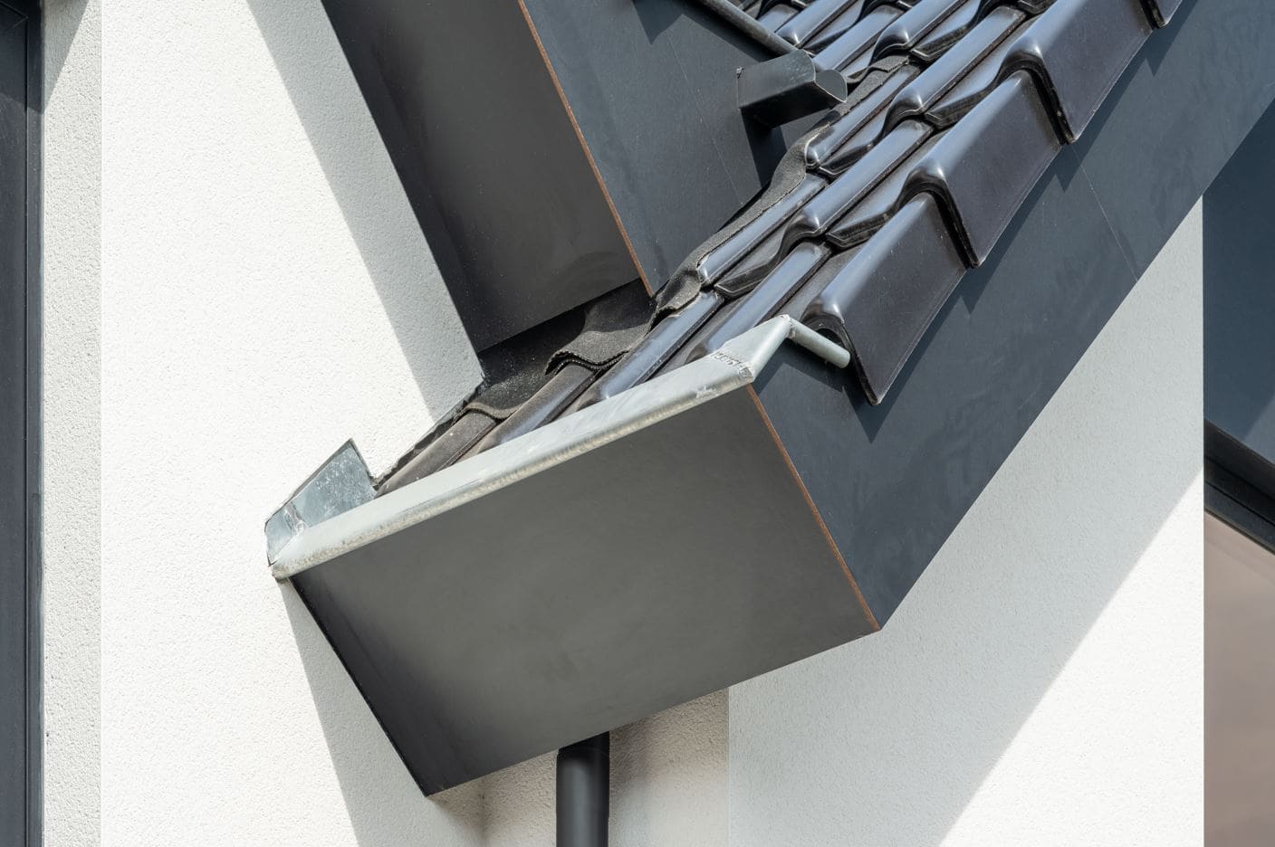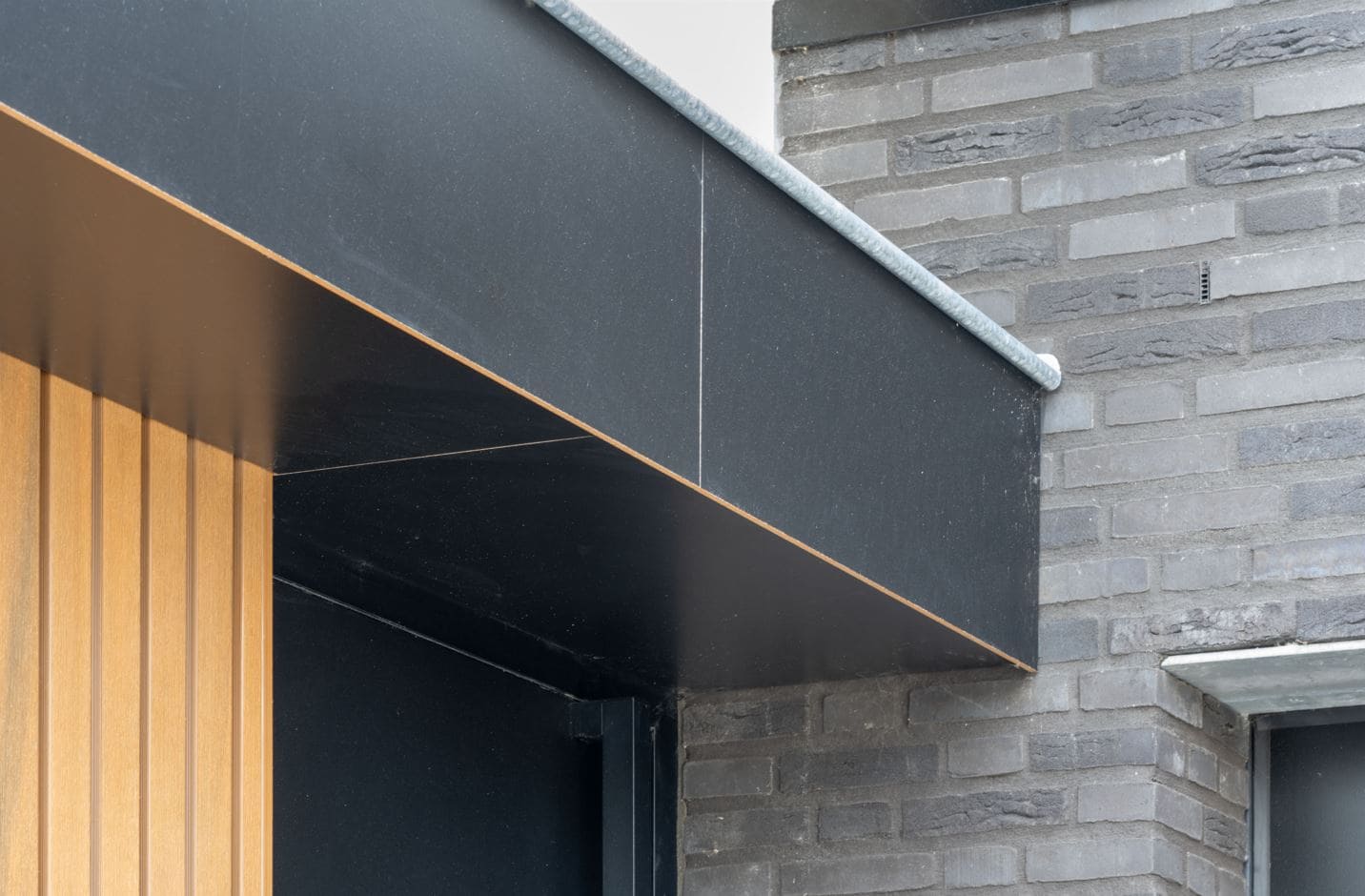 Een opvallend architectonisch element is het antracietkleurige overstek, uitgevoerd in Rockpanel. Dit accent geeft de woning niet alleen diepte en dynamiek, maar onderstreept ook de hoogwaardige afwerking van het geheel. De materialen zijn gekozen vanwege hun duurzame eigenschappen en onderhoudsvriendelijkheid, wat deze woning toekomstbestendig maakt.