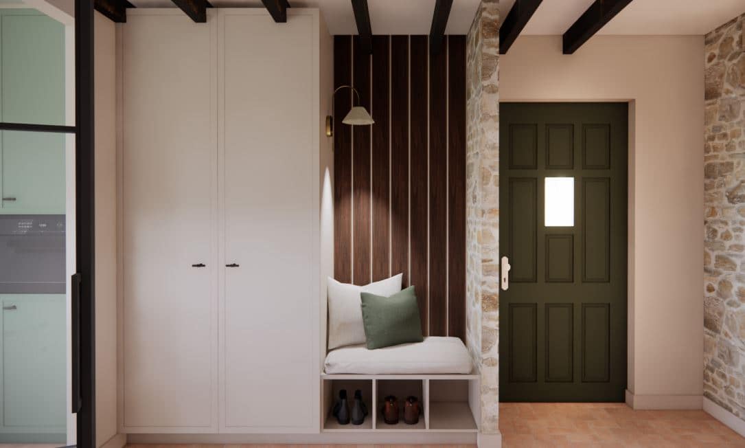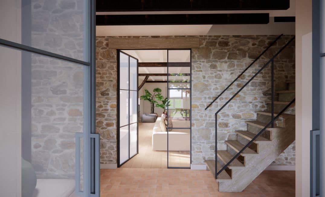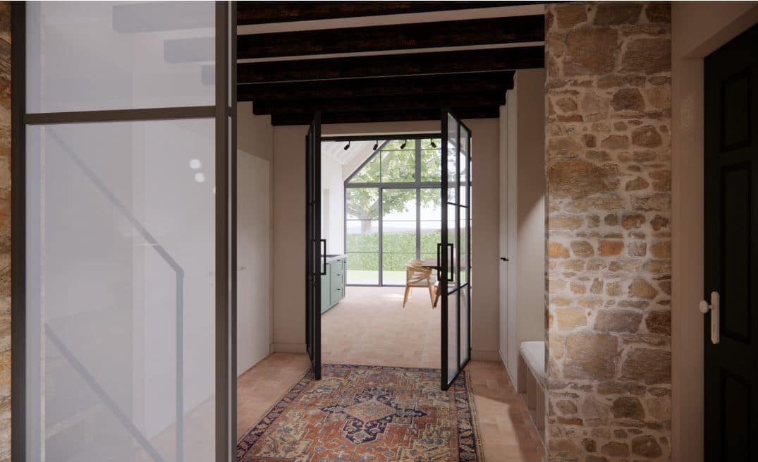 De woning, gebouwd in herkenbare boerderijstijl, krijgt een nieuwe uitstraling zonder zijn ziel te verliezen. Robuuste steens muren en authentieke houten balken blijven zichtbaar in het interieur. Deze oorspronkelijke elementen vertellen het verhaal van het huis en vormen een warme, tastbare basis voor het nieuwe ontwerp. Door ze bewust in het zicht te houden, ontstaat er een krachtig samenspel tussen verleden en heden.