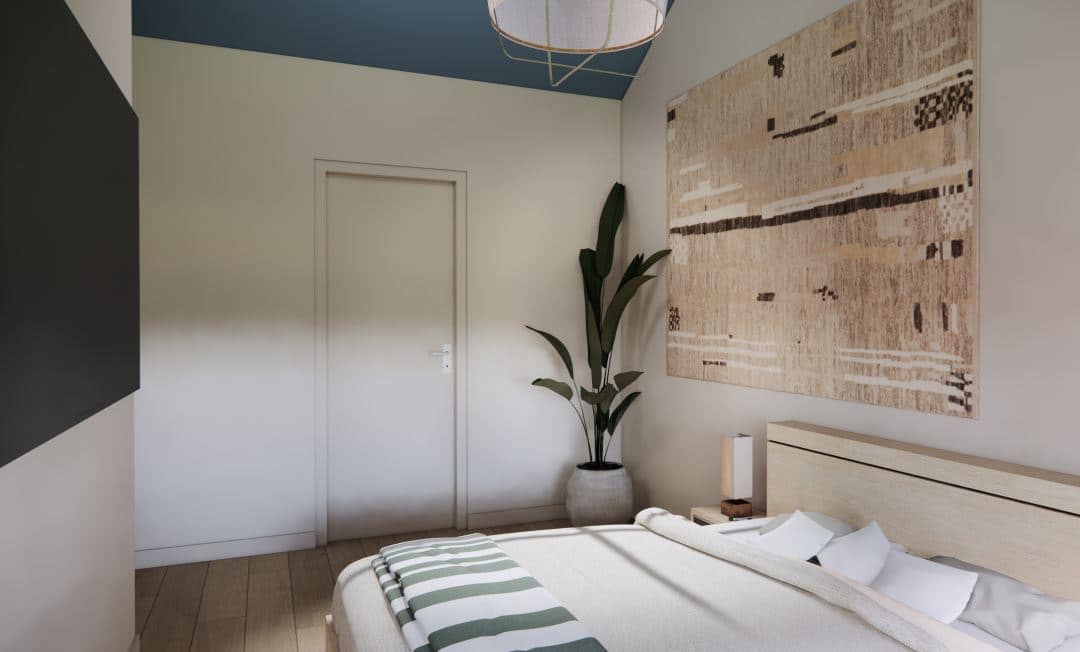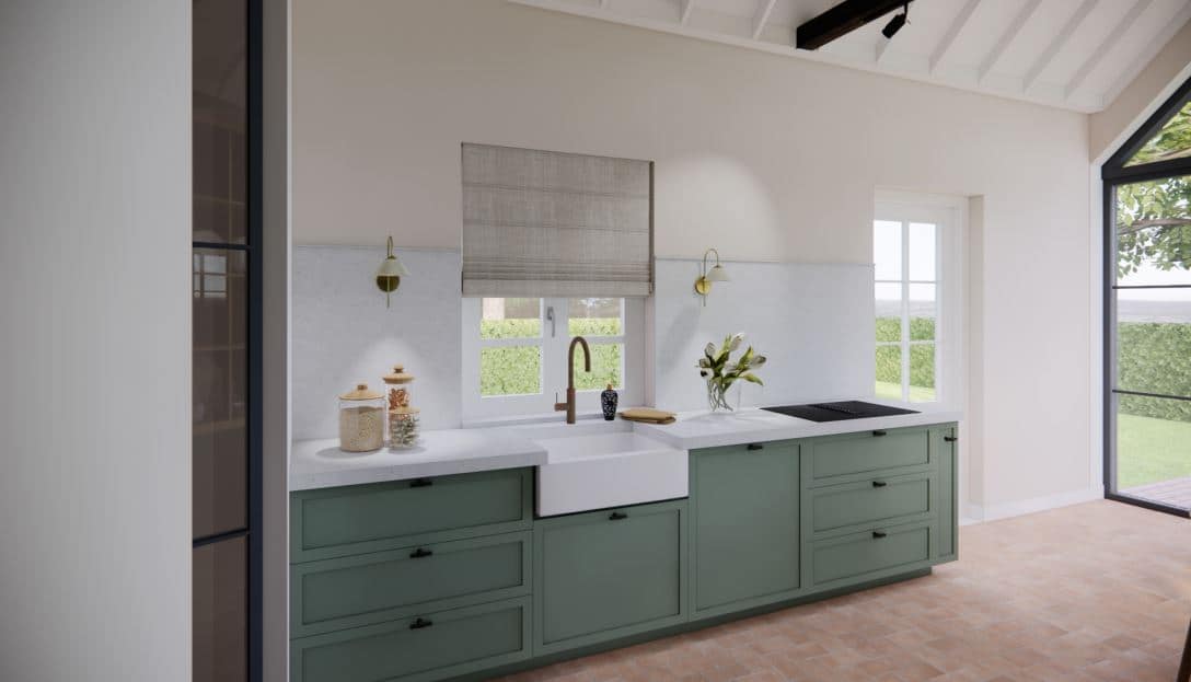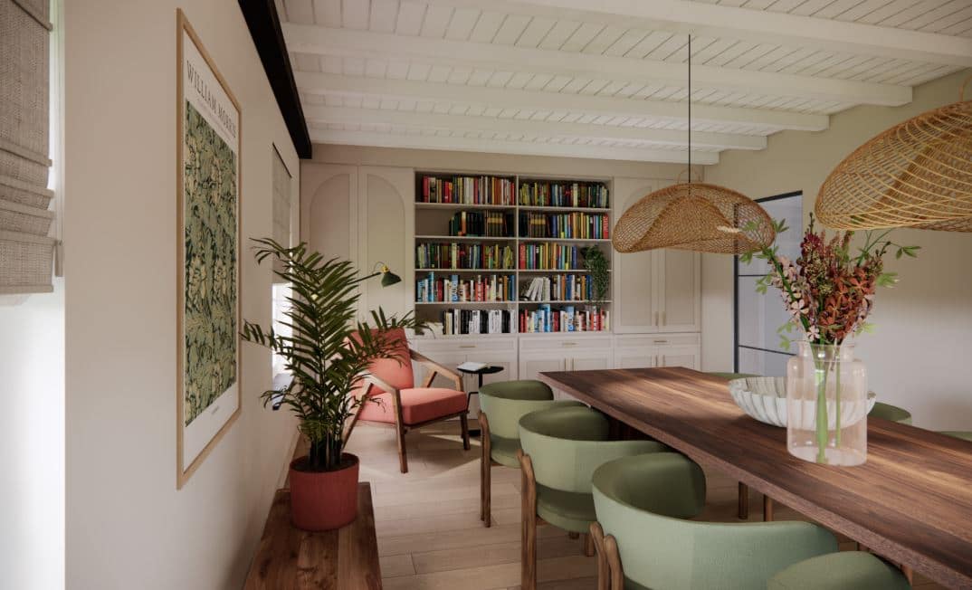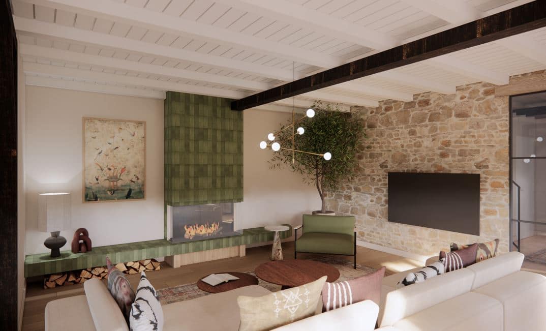 Binnen krijgt de woning eveneens een moderne update. De bestaande open haard blijft behouden, maar wordt opnieuw bekleed met glanzende groene tegeltjes. Zo ontstaat een stijlvol, hedendaags middelpunt dat warmte en karakter uitstraalt. De kleur groen speelt sowieso een centrale rol in het interieurontwerp. Deze natuurlijke tint keert terug in meubels, accessoires en afwerkingen en versterkt de relatie met het omliggende landschap.